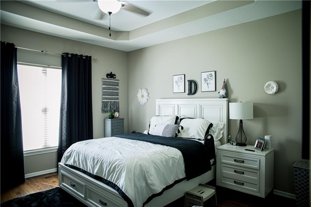 This home has been tastefully decorated and meticulously maintained. It's so stunning it could be on HGTV. Hardwood floors throughout the main level, with a tiled laundry room. Rooms are spacious, especially the master ensuite. In fact, there are two master ensuites: one on the main level and the other in the lower level. The lower level master bath has heated floors and the LL walk-in closet includes the 2nd laundry hook-up. There is a family room with a game area and bar in the LL, as well. Updates to the home include a new water heater, all flooring, light fixtures and ceiling fans, furnace, water softener, roof and cooktop. The backyard is enticing with a covered patio and a separate cement pad for additional entertaining. The newer Basehor Elementary School is within walking distance, and the HOA provides a swimming pool, shelter, and basketball court. Don't miss this stunning home!