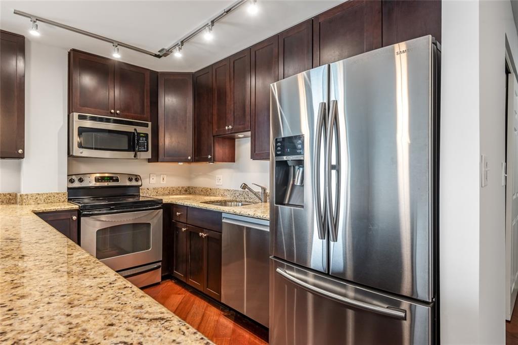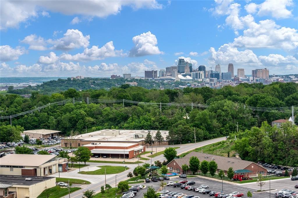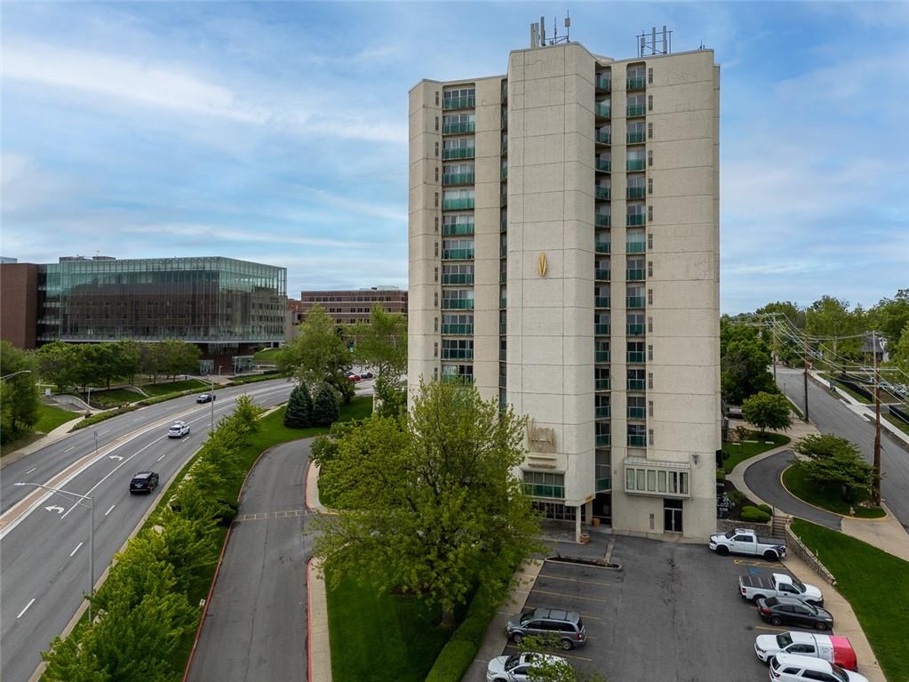 Spectacular view being located on the 14th floor! Own your condo and enjoy being located across the street from KU Medical Center. A great opportunity for medical students and medical professionals with secure covered parking in building. This two bedroom, two bathroom unit has brand new neutral paint throughout all rooms and ceilings, new carpet in the primary bedroom, new sliding closet doors w/mirrors, sliding glass door to small balcony, gorgeous glistening wood-type floors in main area and second bedroom. Granite counter tops with under cabinet lighting in kitchen and stainless appliances (newer refrigerator), washer and dryer that stay. Bathrooms have travertine tile with primary having a walk-in shower and 2nd bath having tub with shower. Two parking spots included with one inside secure, covered garage and one on surface lot. Oversized storage cubicle is included located on ground floor. HOA amenities include water, trash, quarterly pest control, fitness center, theater room, meeting/study room, billiards/recreation room, study lounge, welcoming staff & secure entry to building. Easy highway access, many restaurants & shops close by.