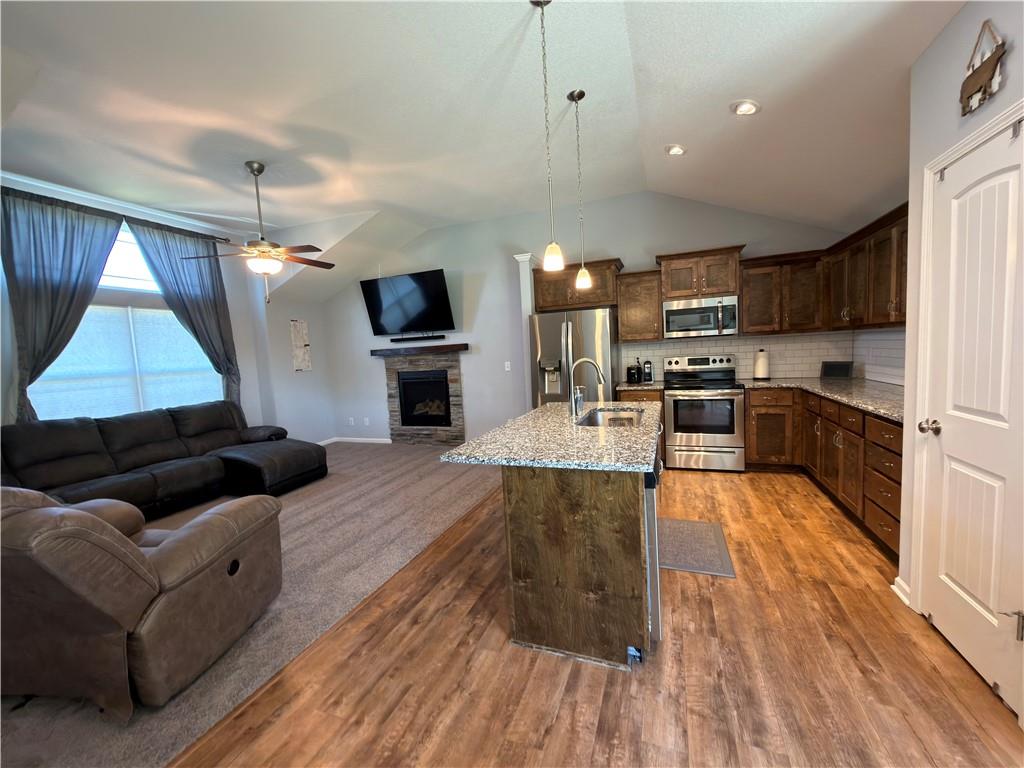Immaculate Newer Build in a Highly Desirable Neighborhood Step into this beautifully maintained, pet-free and smoke-free home offering modern comfort, tall ceilings, and a bright, open feel throughout. The main level features a welcoming living room anchored by a gas fireplace, adding both warmth and charm to the space. The kitchen is designed for style and function with attractive stainless steel appliances that stay, granite countertops, a convenient breakfast-bar island, and a kitchen/dining combo that adapts easily to everyday living or entertaining. With 3 spacious bedrooms and 3 full bathrooms, this home provides flexibility for guests, family, or work-from-home needs. The finished basement includes its own full bath—perfect for convenience and additional living space. A 2-car garage offers secure parking and storage, the large backyard features a storage shed and attractive wooden fencing, rounding out this exceptional property. Immaculate, versatile, and located in a fantastic neighborhood, this home is truly move-in ready.