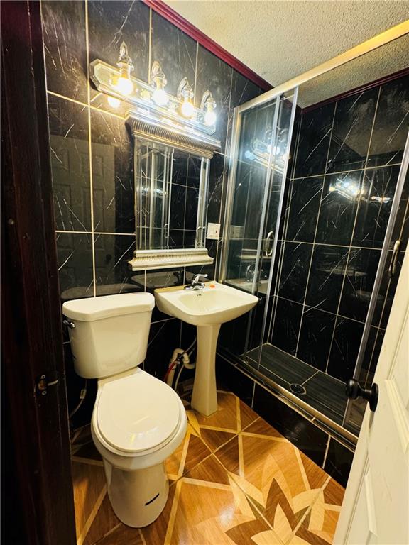 Bathroom with a textured ceiling, tile walls, toilet, and a shower with door