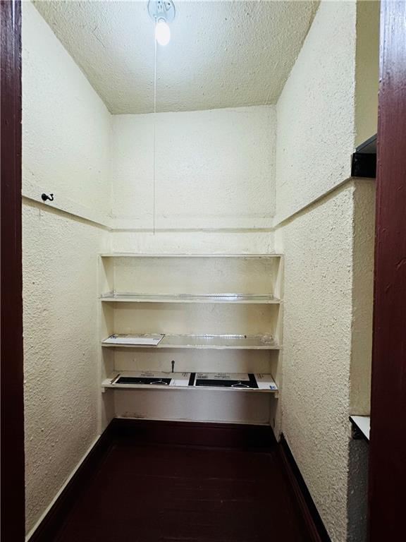 Empty room featuring a textured ceiling and dark hardwood / wood-style flooring