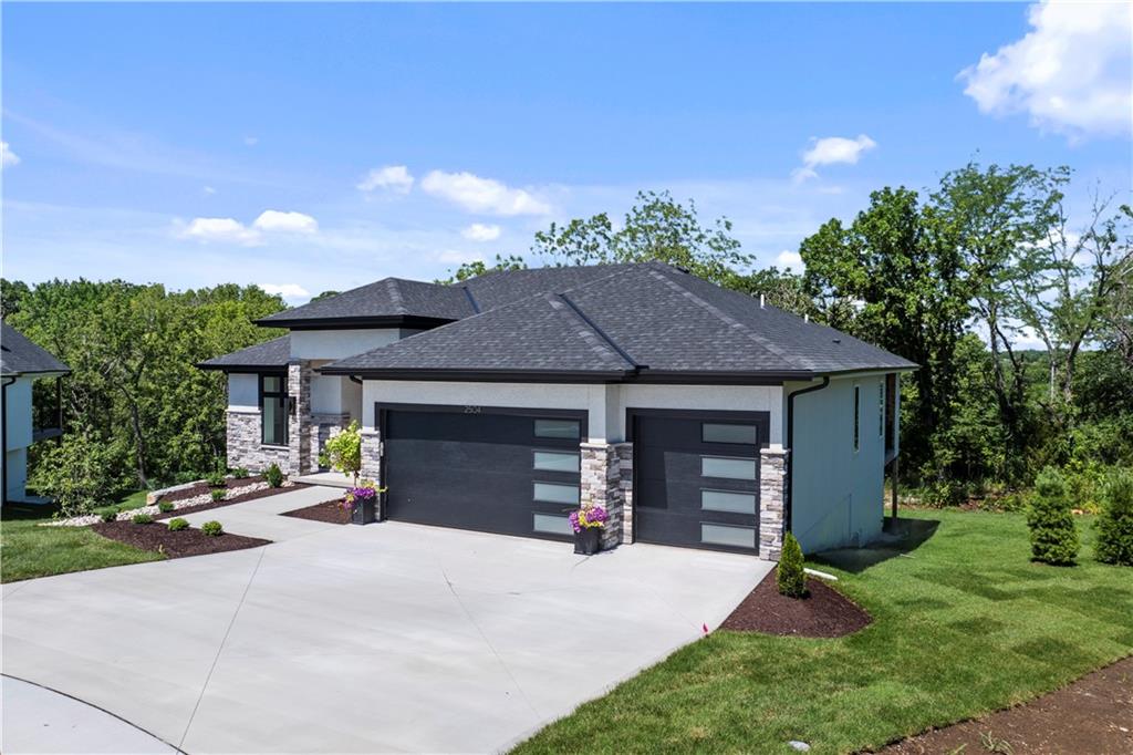 Stunning Modern Gunnison by JFE Construction! This home sits on a wooded lot with nature views from the back, and you will have a covered deck with a fireplace to enjoy it! The kitchen offers a large quartz island and a generously-sized pantry. Custom built-in features, accent walls, and custom trim work throughout! You'll love this one! While living in Woodland Oaks, enjoy the benefits of exclusive amenities in the surrounding area, including Lake Jacomo! Woodland Oaks is also a short walk away from Legacy Park, with a state-of-the-art community center, and the Legacy Park Amphitheater. Enjoy miles of walking trails, a disc golf course, and sports facilities for all ages, all in a convenient location to your home. Home is under construction and final pricing is subject to change. The specification sheet will outline planned finishes for this property, and supersede any details, photos, drawings, or depictions used for marketing purposes on this listing.