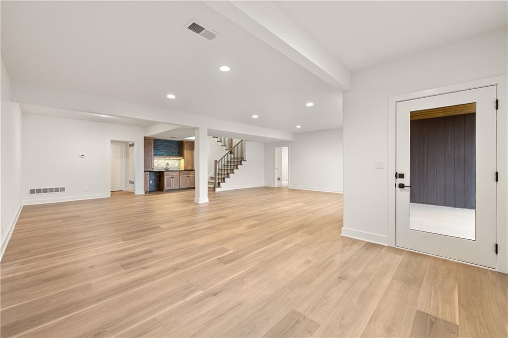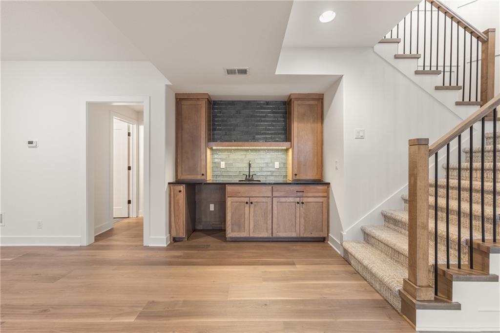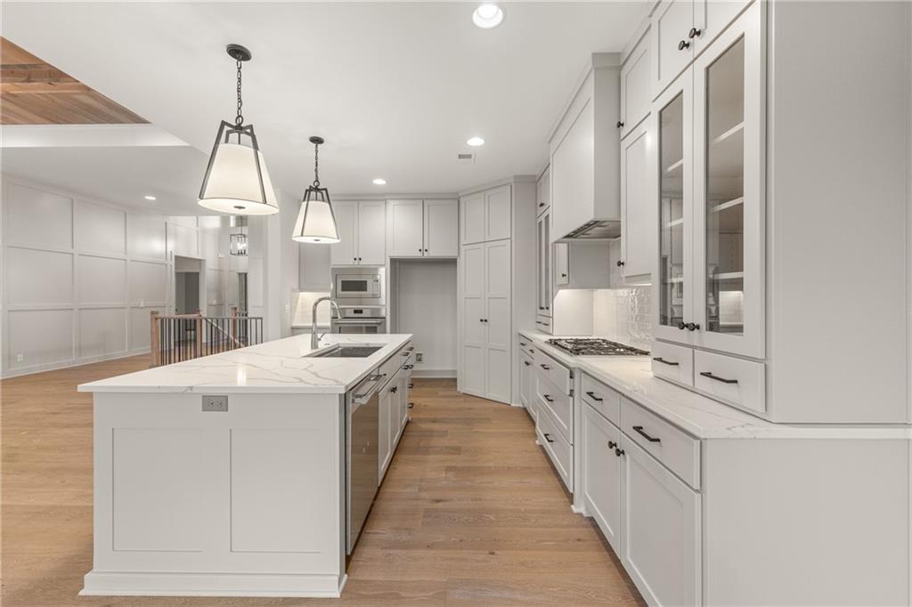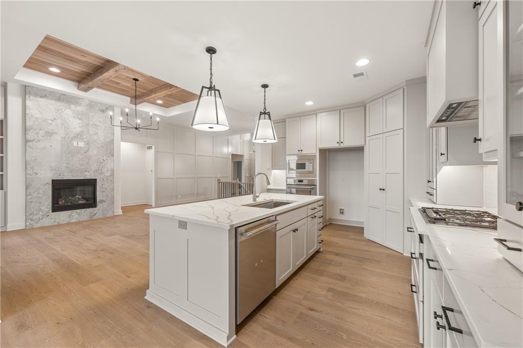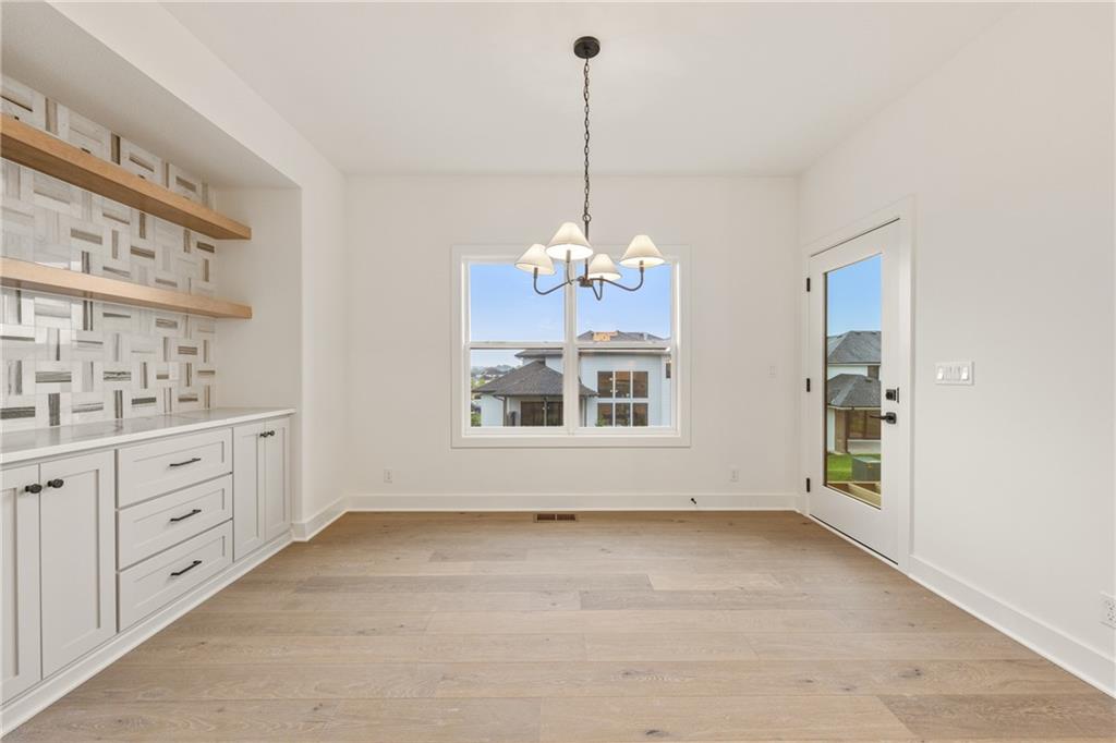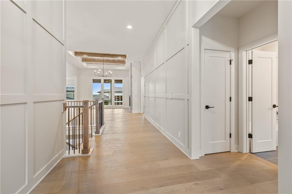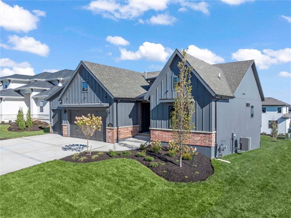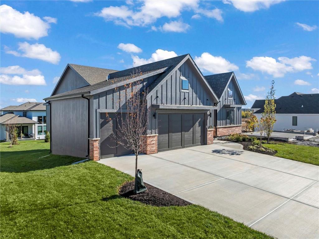 MOVE IN READY! The modern Riviera REVERSE by SAB Homes located on lot 184 in a cul-de-sac with a full finished walkout basement. You will love this new modern twist to a classic reverse floorplan at just over 3000 square-foot. with spectacular curb appeal featuring high peaks, vertical accent siding, metal accent roof, blackened bronzed windows, and super dark charcoal paint with red brick trim. Stunning! This home also features an ideal plan floor plan with a main floor primary suite and an office/ second bedroom with access to the covered 16' x 12' deck from the dining room and bedroom. Enjoy the finished walkout lower level with two more bedrooms, large family room with LVT flooring, parallel wet bar and a door to the backyard, plus plenty of room for storage. Perfect outdoor space under a 16' x 12' covered patio with full sod front and back, sprinkler system and front landscaping package included. This home is loaded with upgrades; gas cooktop, quartz countertops, decorative bath mirrors, Maxx Lounge freestanding tub, bump out in the dining area for hutch or china cabinet, boot bench at garage entry, large windows, floor to ceiling tile fireplace with accent ceiling trim in great room, vertical shiplap accent wall in the office with 3 ceiling beams, wainscoting at entry and stairwell and light wood flooring. Century Farms has a spectacular club house with a farmhouse twist ideal for neighborhood gatherings or private parties with reading loft and a fitness center. There are plenty of neighborhood activities with a fire-pit, two pickle-ball courts and a basketball hoop, kids play area, wildflower walkways and a community garden. Century Farms is conveniently located near the brand new Bluhawk shopping center, Heritage Park, the Johnson County Trail system and the Overland Park Arboretum. Come join the fun in Century Farms, a unique one of a kind upscale new home community in Overland Park. BLUE VALLEY SCHOOLS