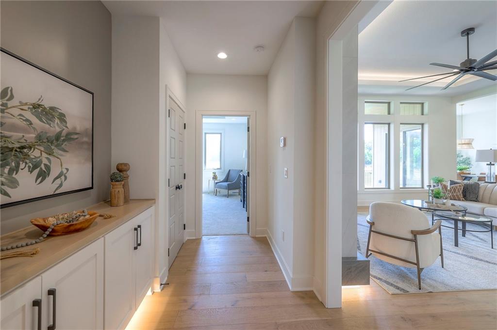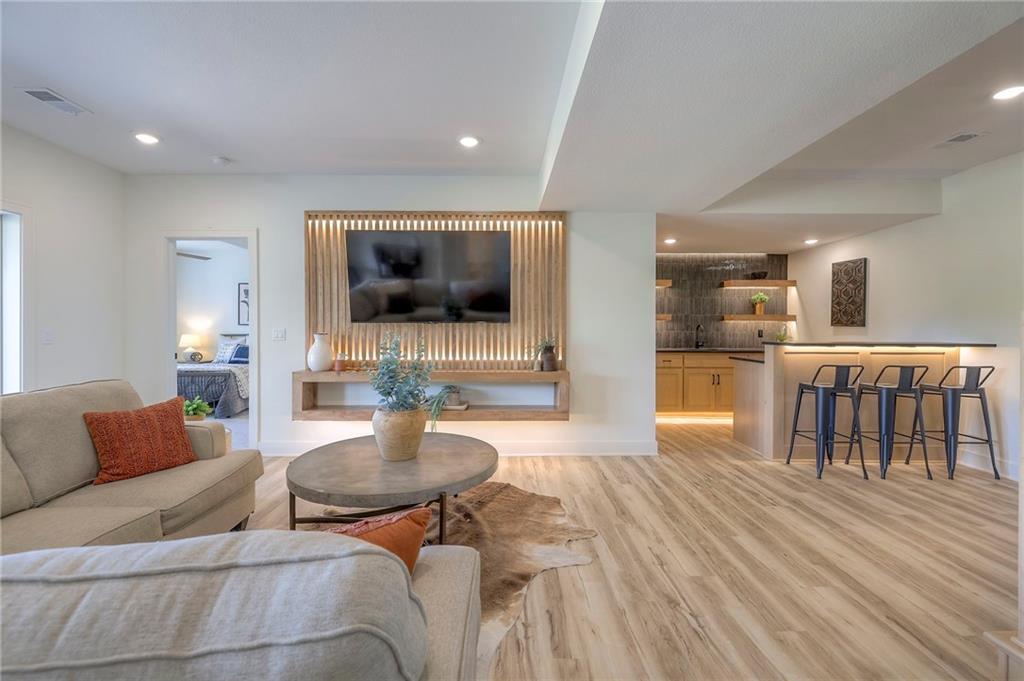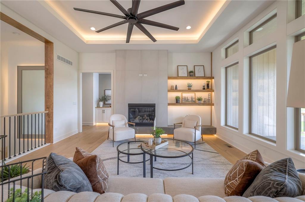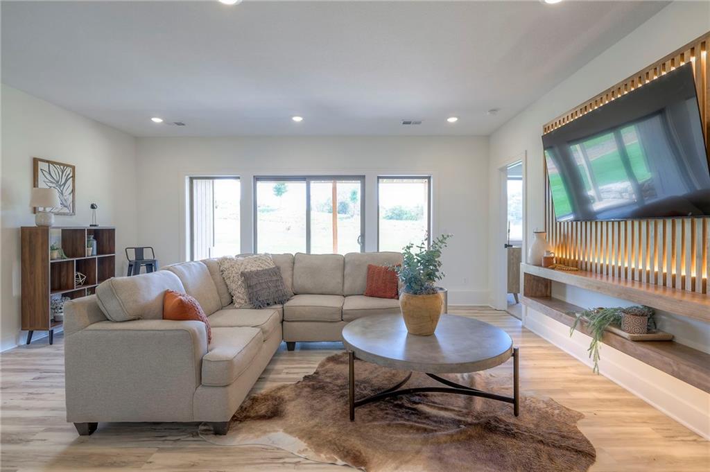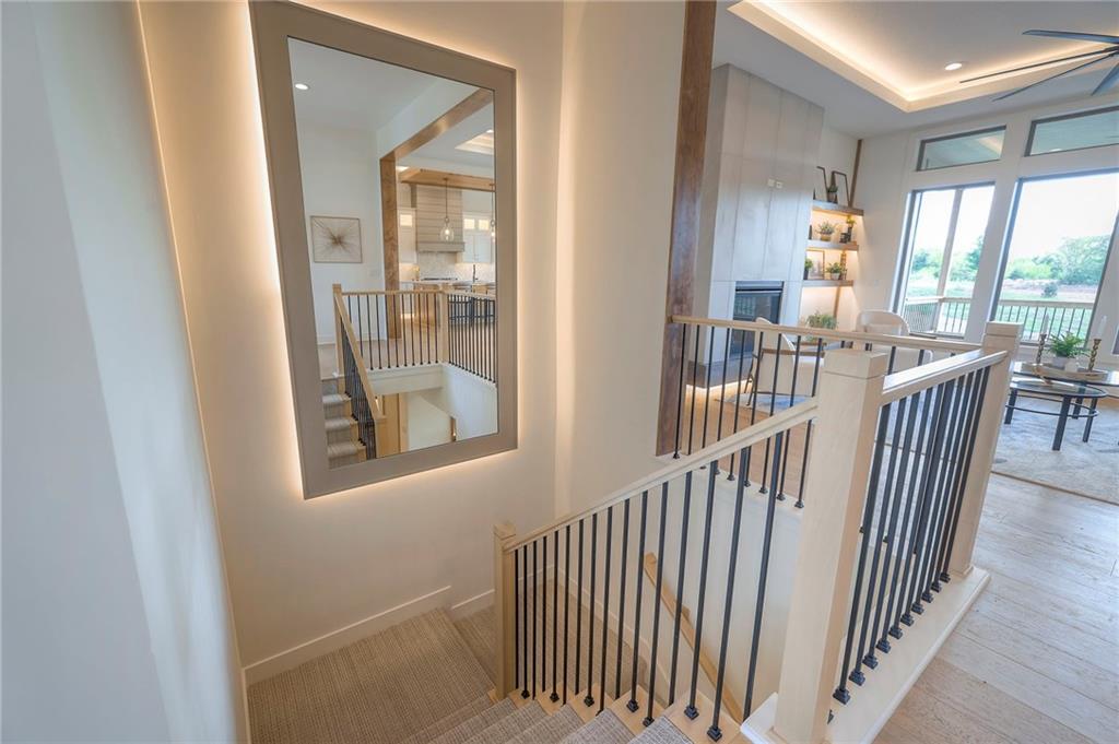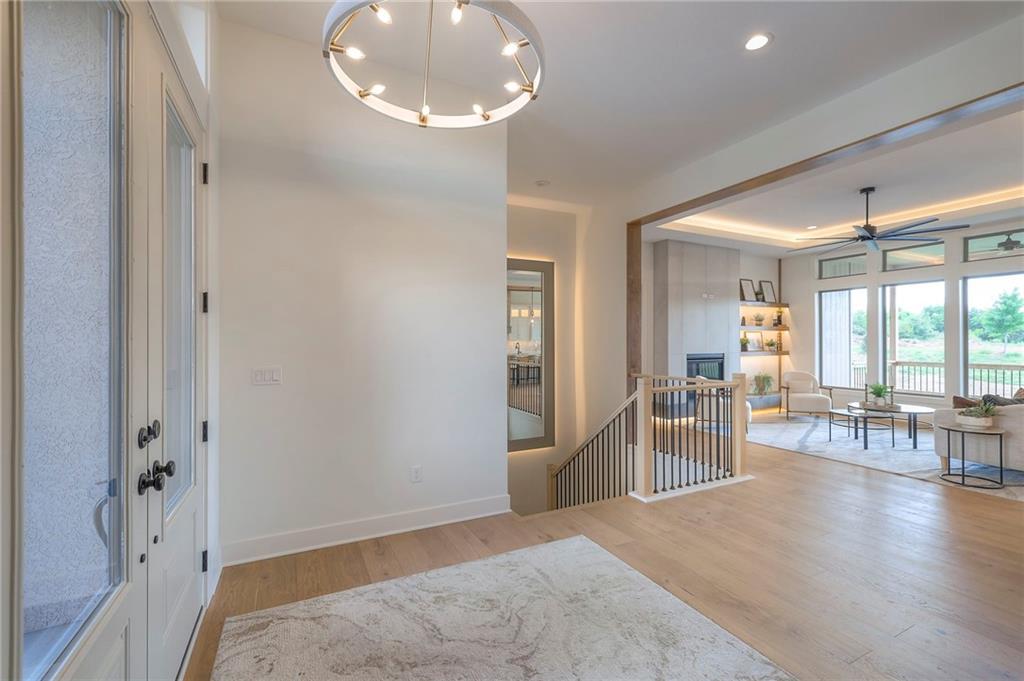 Stunning and spacious Lyle Reverse plan by Bryant Ratliff with 4 Bedroom and 4 Full Baths. Large entry greats you into this open and spacious floor plan. Great room has hardwood floors, soaring ceiling and floor to ceiling stone fireplace. Kitchen features custom cabinetry, oversized island, stainless appliances, walk-in pantry, & access to huge covered deck. Large master suite with custom tiled large shower and sizable walk-in closet with access into the laundry. 2nd bedroom and full bath on main floor. Lower level features family room w/custom tv wall, bar area and 2 additional bedrooms each w/their own baths. Walk out to a patio with large yard backing to bermed greenspace. Home is located on an estate lot and includes lawn irrigation. Home is located in Woodland Trails, an outdoor lifestyle community featuring miles and miles of paved walking trails, resort style pool, playground, sports field and fishing ponds.