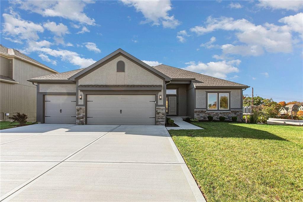 The Richmond by Hoffmann Custom Homes — a true ranch where stylish design meets effortless living. This home is currently under construction; photos shown are of a previously built model. Estimated completion in March of 2026. The floor plan features a striking entryway, a spacious great room with soaring ceilings, and an open-concept kitchen with light engineered hardwood floors, creamy white enameled cabinets, fresh modern lighting, and a large island topped with gray quartz. A covered deck sits just off the dining area for convenient outdoor access. Built with 2x6 exterior wall construction, this home is engineered for durability and energy efficiency. It comes pre-wired for easy solar panel installation and includes an EV charger receptacle, and additional energy-efficient upgrades. A 10-year structural warranty provides added peace of mind. The lower level is stubbed for a future bathroom, offering flexibility for later expansion. Located within the top-rated Platte County School District.