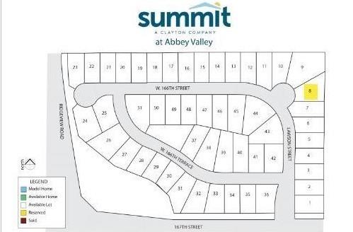 GPS may be incorrect. 167th and Ridge view is now open! 169 S to 159th and go east. 159th east to Ridgeview. Right (South) on Ridgeview and go east at the roundabout on 167th. 167th east to Lawson Drive. Arrive at Abbey Valley.. Turn Left (east) on 167th st to Lawson St. Turn Left (north) on Lawson st to W. 166th st. Turn Left (west) on w 166th st. and the lot will be the 9th lot on your right (North Side of the Street). From the south - take 175th to murlen and go left (west) at 167th. Continue on 167th until Lawson street and the entrance of Abbey Valley. This Home is under construction and estimated to be fininshed mid March.