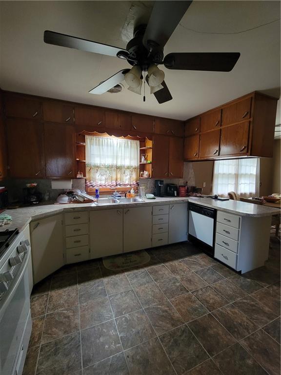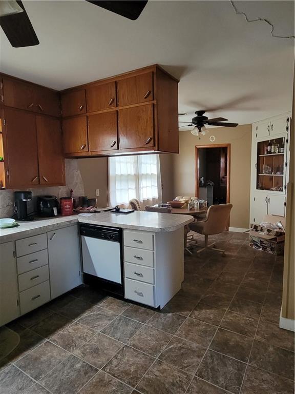 Kitchen featuring stone finish floor, ceiling fan, light countertops, a peninsula, and dishwashing machine