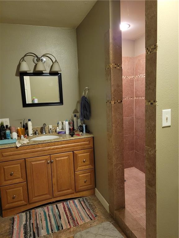 Full bath featuring vanity, tile patterned flooring, and a tile shower