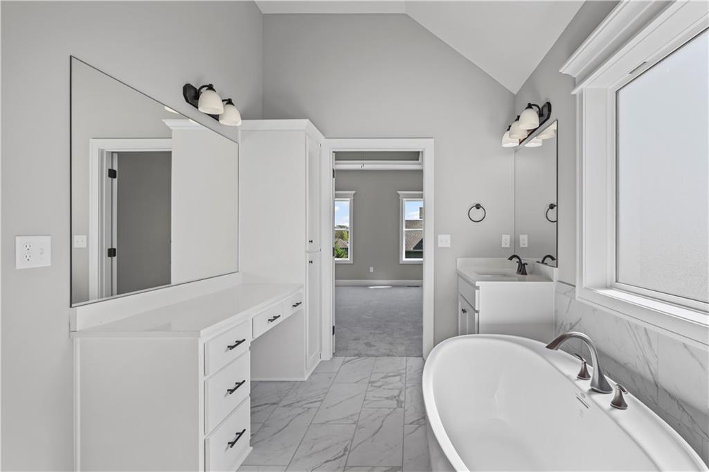 The Drake by Hoffmann Custom Homes is a Reverse 1.5-story home filled with natural light, high ceilings, and refined modern finishes. The main floor features dark engineered hardwood floors, a stylish kitchen with light granite countertops, dark hardware and faucets, gas cooktop, wall oven, enameled cabinets, and under-cabinet lighting. A modern gray stone fireplace with enameled wood trim accents warms the great room, which opens to a covered deck. The main level features the owner’s suite - complete with a free standing soaker tub, double split vanities, and a generous walk-in closet - plus a second bedroom or office, a full bath, and a convenient laundry room. The finished lower level adds two bedrooms, a full bath, a spacious rec room with a granite wet bar, and walkout access to a covered patio and oversized backyard. Engineered for modern living with 2x6 exterior wall construction, pre-wired for easy solar panel installation, a 10-year structural warranty, EV charger compatibility, and enhanced energy-saving features. The subdivision’s sales office is a Drake model, available to tour during office hours. The home is fully complete; photos represent the property as built.
