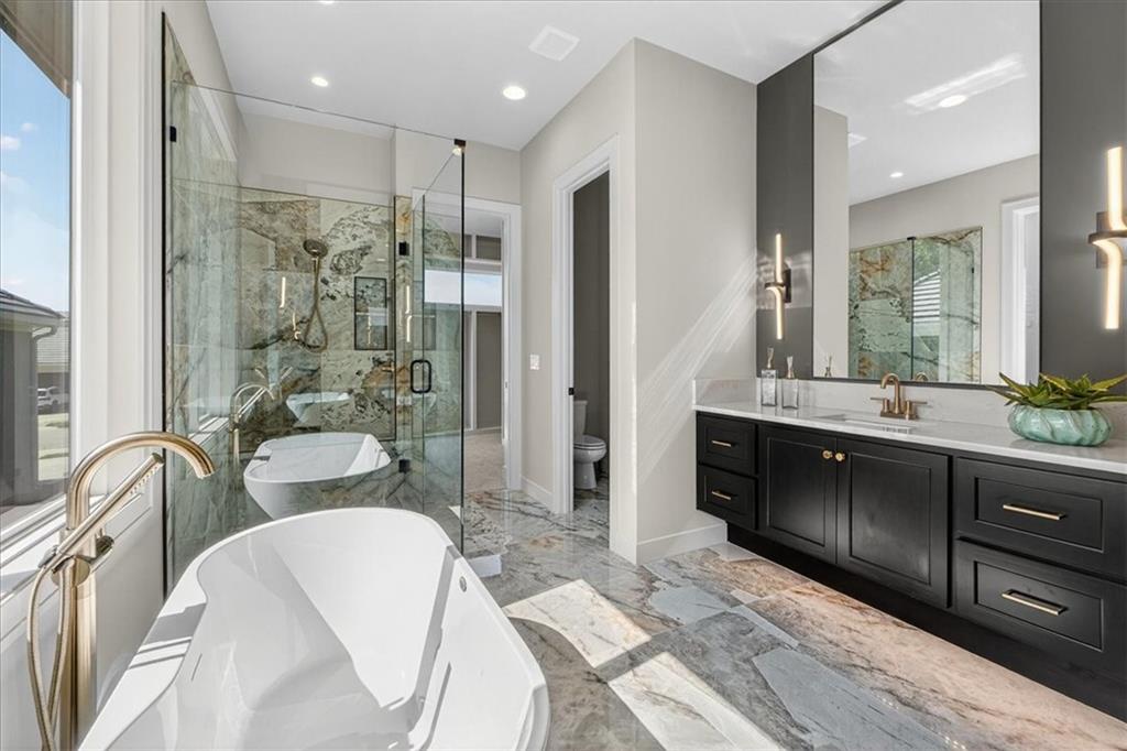 Don Julian masterpiece plan!! Ready to move in! The Sterling Reverse 1.5 story is sure to impress with its unique twist on the reverse floor plan. 5 bedrooms, 4 baths with 3 car garage- 4271 sq feet of luxury living! Soaring ceilings, wide open plan & walls of windows! Kitchen includes incredible quartzite countertops, custom cabinetry and walk thru pantry. Primary suite on main- incredible ceiling/wall details and spa like bath with dreamy finishes/plumbing fixtures and huge walk in closet. 2nd bedroom/office on opposite side of house for the ultimate in privacy. Enjoy the huge covered patio overlooking large private yard. Lower level has 3 large bedrooms, 2 full baths, family room with gorgeous walk up bar, ample storage and large sliders leading to paved patio. Not a detail missed in this incredible home- SO many upgrades and special moments through out- Do not miss your chance to live in this exclusive neighborhood- only a few homes left! Call today for a tour! Buyers agent to verify taxes and square footage. Home is completed and staged -professional photos are COMING SOON! (Floor plan shown in photos has minor differences- deck has been moved to middle of house)