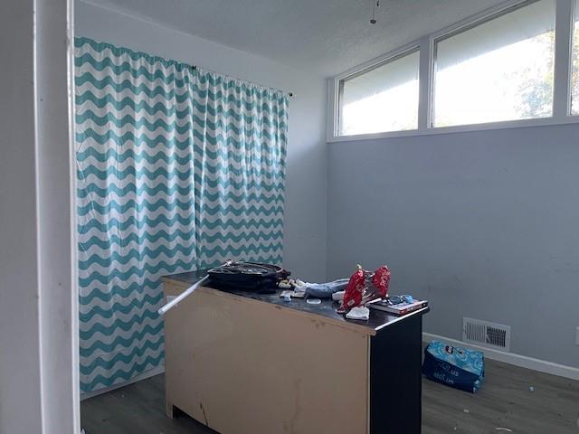 Office area featuring wood finished floors, baseboards, and a textured ceiling