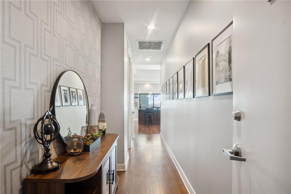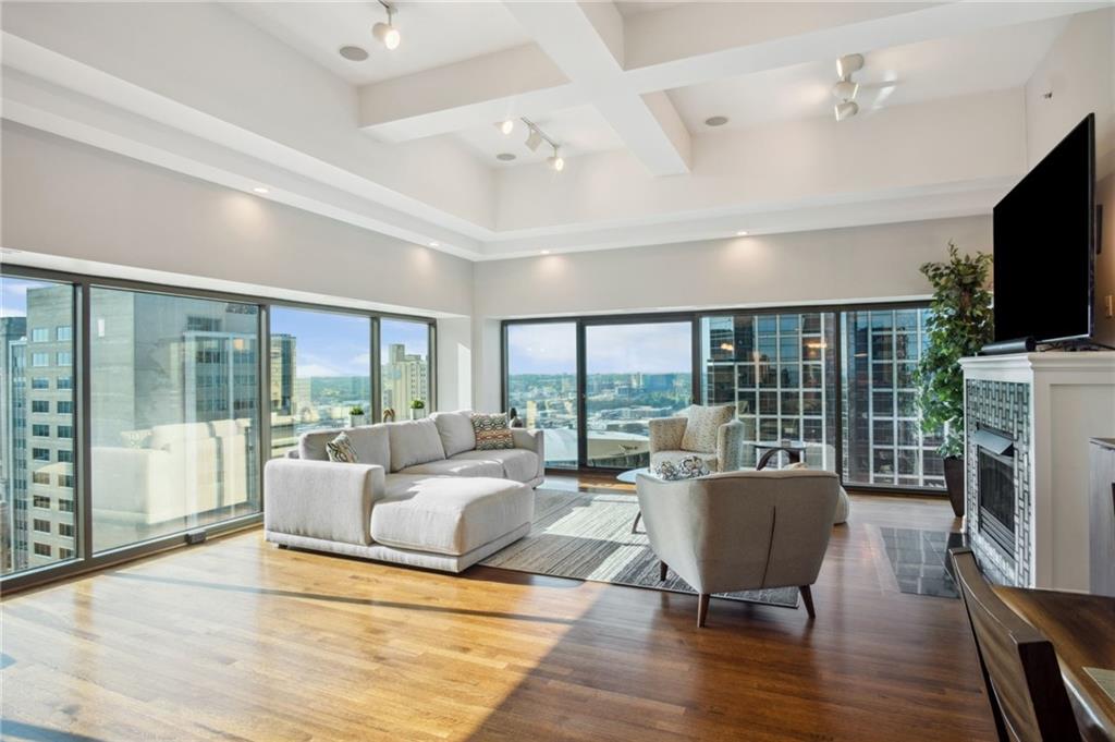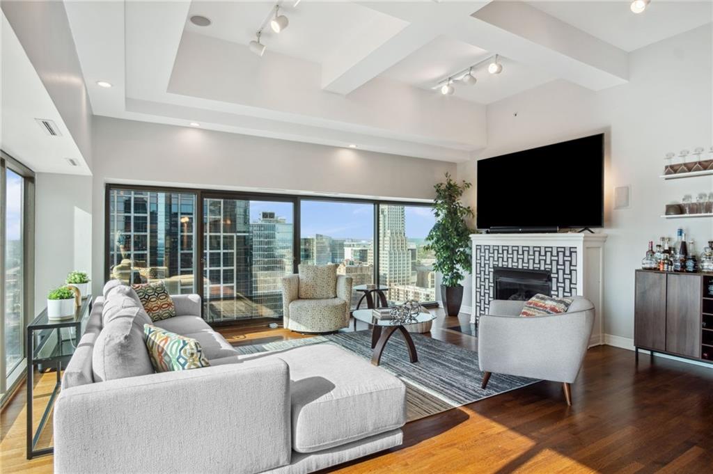 The most sought out Views in the building, 09 units rarely come on the market facing Southeast. Windows galore with natural light flowing in. All bath rooms have been renovated with new counter tops, floors and tile in the showers. New tiled fireplace and backsplash in kitchen. Harwood floors throughout living area and new carpet in both bedrooms and new paint throughout the unit. Enjoy the breathtaking city Views. Fantastic closet space, Large TV with custom tile stays in bedroom, open floor plan and convenient to everything! This building offers a rooftop pool, fitness center, theater, grilling area, 24 hour doorman and concierge, 2 secured parking spaces.