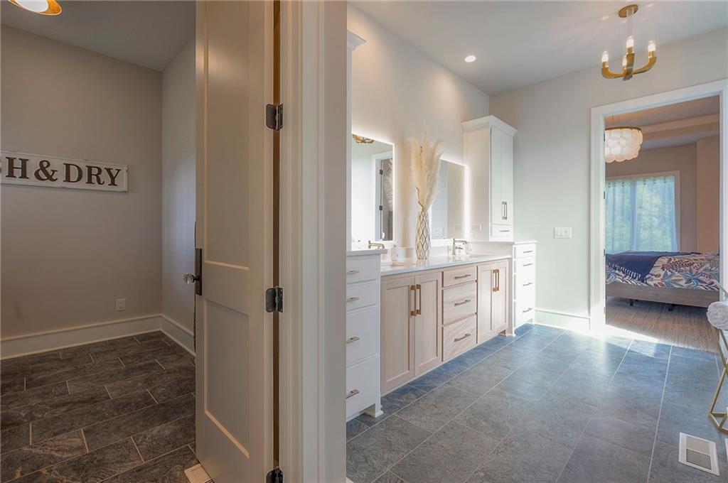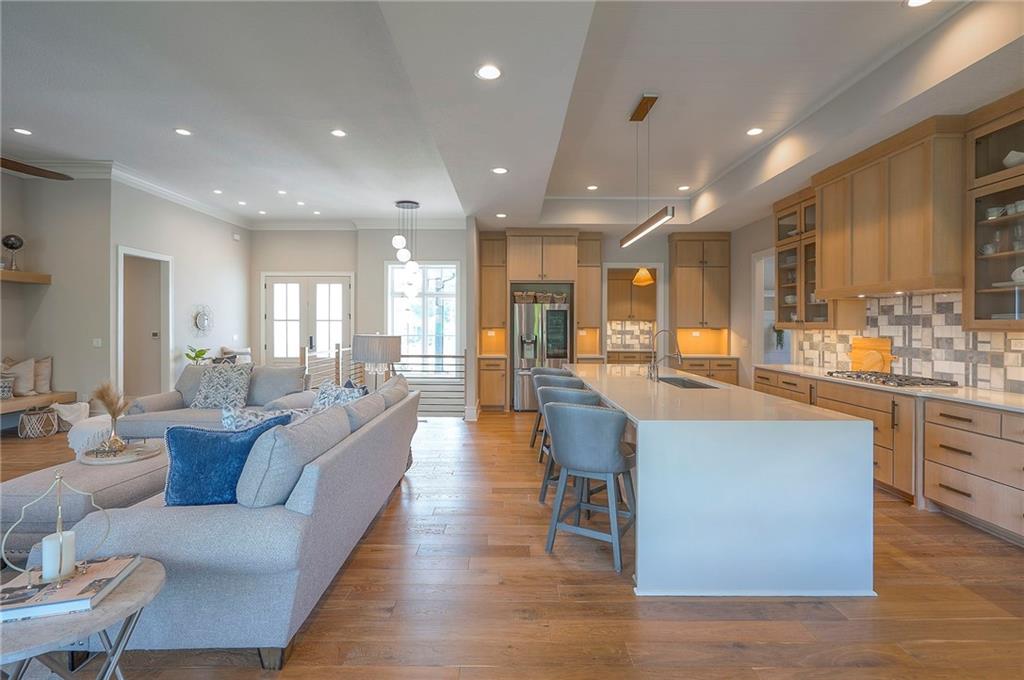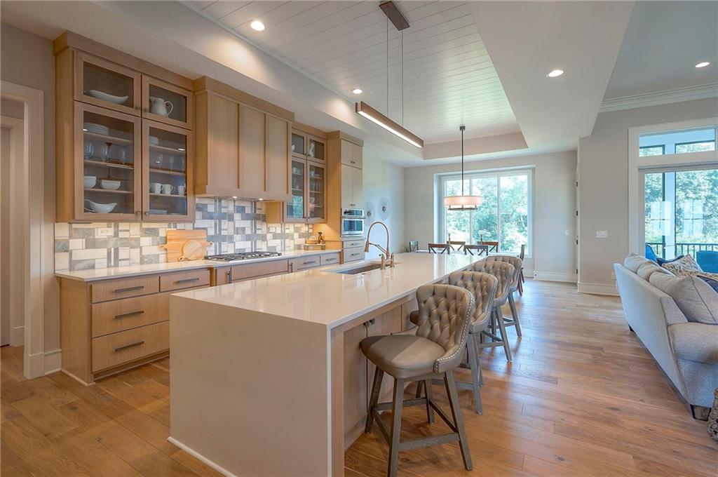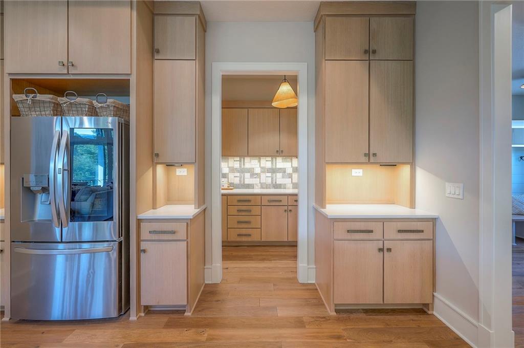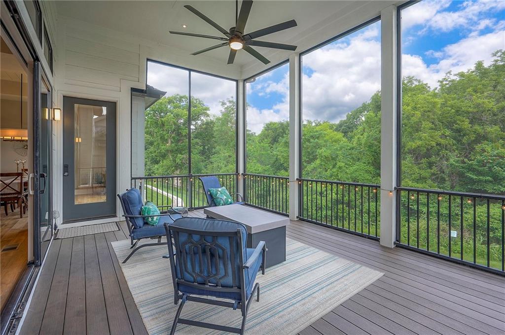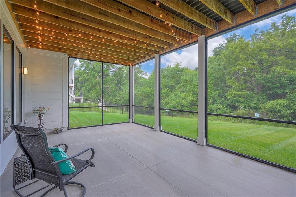Step into this stunning custom Homes by Chris residence, beautifully landscaped and featuring a charming front porch that warmly welcomes you home. Nestled against serene woods and a protected stream, this property offers the perfect blend of privacy and nature. Inside, you'll find an open-concept layout filled with natural light. The spacious kitchen boasts a large island, ample cabinetry, a breakfast room, and a butler’s pantry complete with a beverage center and additional counter space—ideal for entertaining. The luxurious main-floor primary suite features a statement wall, spa-like bath with backlit mirrors, a relaxing soaker tub, and a show-stopping walk-in closet with built-ins, a center island, and a dedicated makeup vanity. The finished lower level includes two additional bedrooms, a rec room with a full wet bar, and an expansive workshop with sealed floors, motion-sensor lighting, and double-door walkout access to the backyard. Whether you're sipping coffee on the screened-in deck or unwinding on the covered porch, you'll love the peaceful backdrop of mature trees and flowing stream. A true retreat with every detail thoughtfully designed.