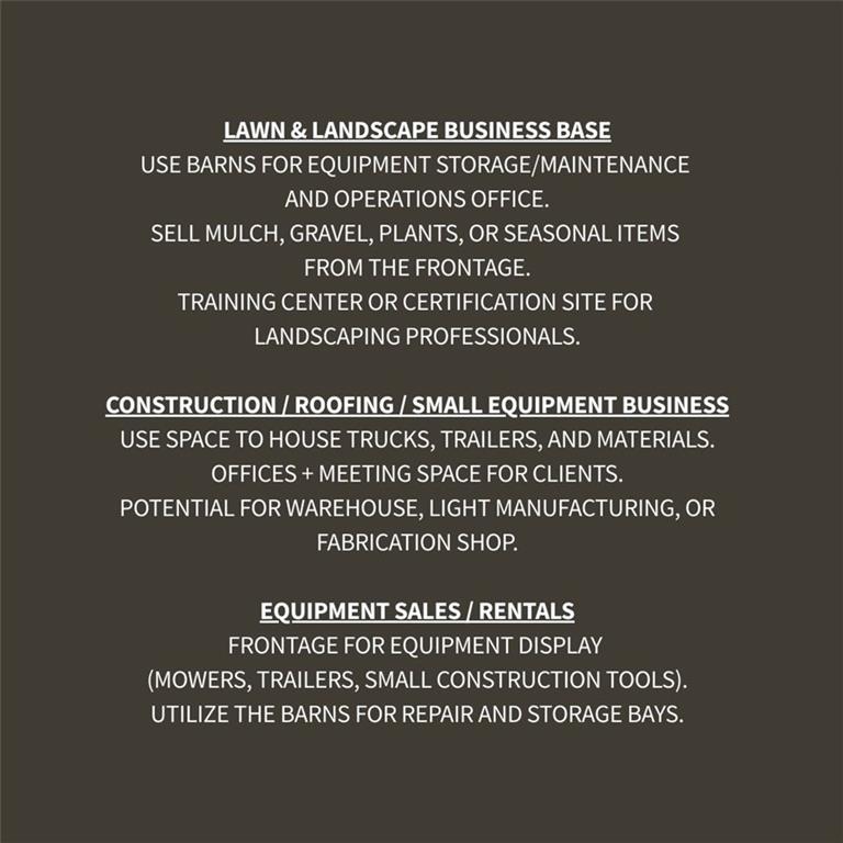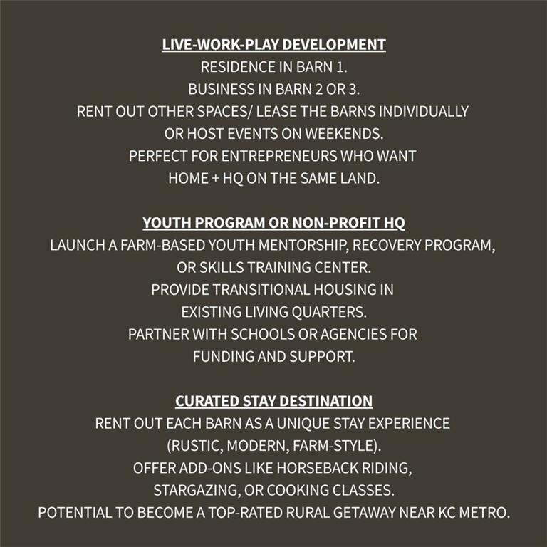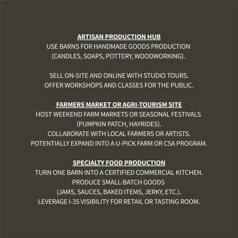 Welcome to a one-of-a-kind property in the Kearney School District that’s equal parts muliti-generational homestead, business headquarters, and peaceful haven. This unique 4.4-Acre Multi-Use Estate offers a perfect blend of classic country charm and business potential, zoned Commercial. The property is ideally suited for a wide range of industries, including lawn and landscape, small equipment sales, roofing, construction, manufacturing, event center space, retreat, or specialty goods production. This versatile property features approximately 9,500 sq ft of total indoor space spread across 4 fully functional barns and a custom coop, providing endless opportunities for various ventures. Barn 1 offers a fully established residence, while Barns 2 & 3 offer conforming and non-confirming living quarters, with kitchenettes & full bathrooms. This property is as multipurpose as it is well-built. Consider an Event Center & transform the spacious barns into elegant event spaces for weddings, corporate events, and special occasions. Utilize the picturesque surroundings for outdoor ceremonies, team-building activities, and overnight retreats. Tap into the growing demand for unique event venues in the area and establish a sought-after destination for celebrations. The property is partially fenced with pasture, woods, & creek. County roads are paved & there's a wide concrete driveway for easy maneuvering & space for plenty of vehicles. Highway frontage along PP & 33, this corner lot offer maximum exposure and visibility. Located off of I-35, this would be an incredible self-sufficient sanctuary or base of operations for various ventures. Whether you’re looking to establish a headquarters, expand operations, or create a self-sufficient base of operations, this property offers the space, infrastructure, and visibility to help your business grow. Also Reference Commercial MLS Listing: 2552144.
