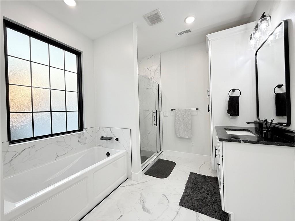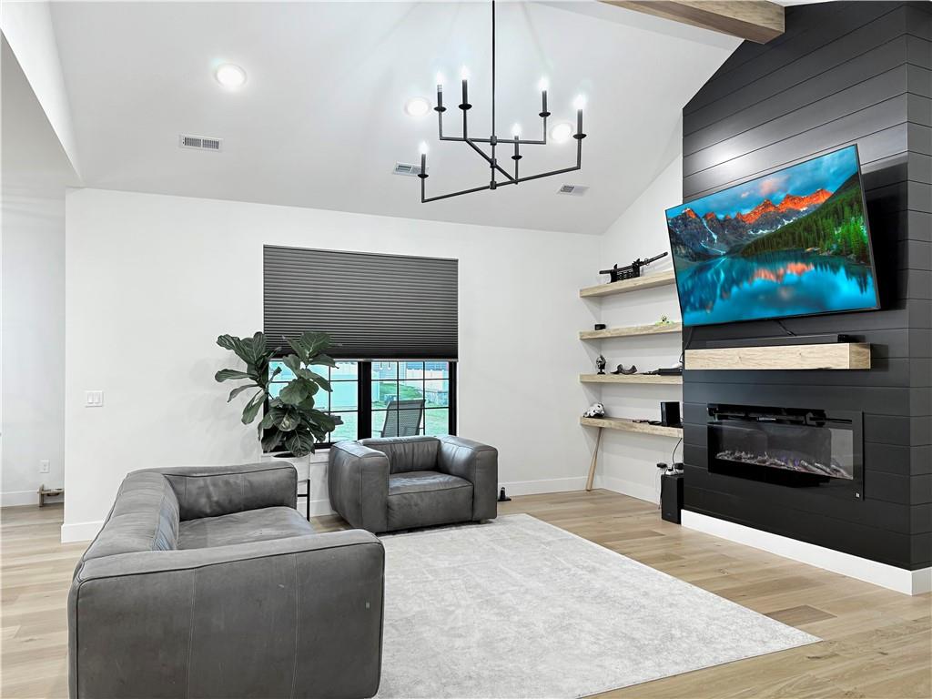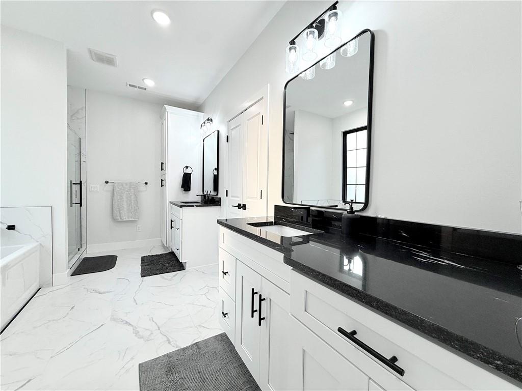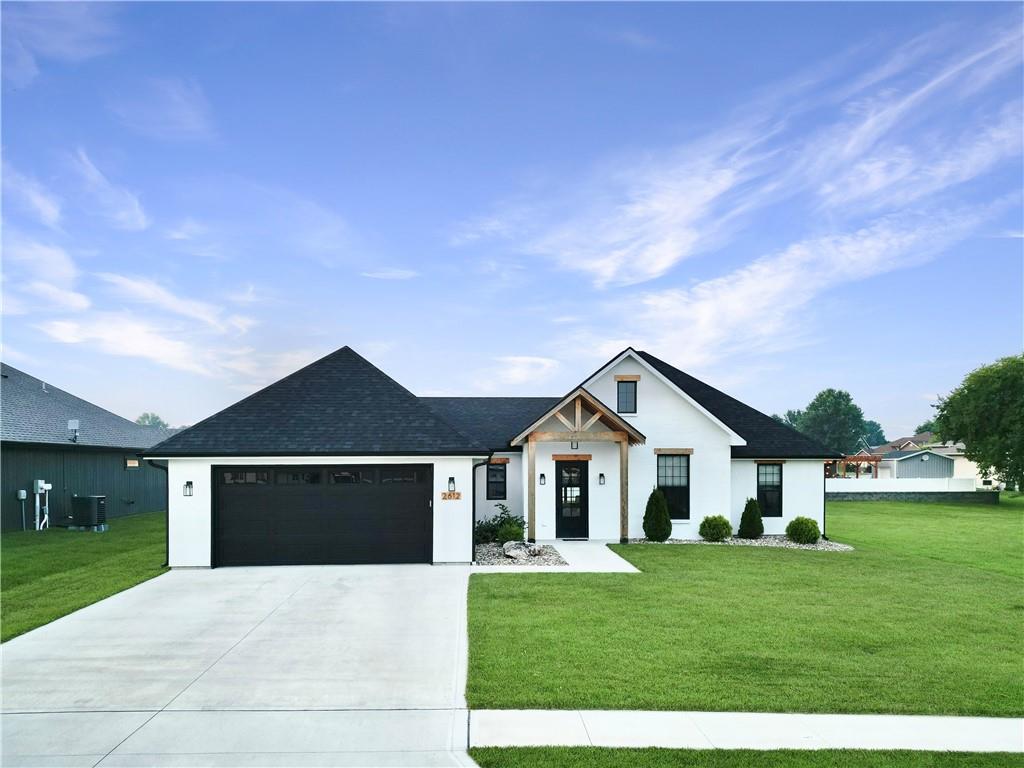 Welcome to this stunning 4-bedroom, 2-bathroom home with striking curb appeal, featuring a crisp white exterior, bold black accents, and warm wood details that create a timeless and modern aesthetic. Inside, you'll find a bright open-concept layout with vaulted ceilings, stylish lighting, and a beautiful fireplace that serves as the heart of the living area. The spacious living room flows seamlessly into a chef-inspired kitchen equipped with sleek black countertops, stainless steel appliances, a deep farmhouse sink, and ample cabinetry. A walk-in pantry with a window adds both charm and functionality. The home also includes a dedicated laundry room, thoughtfully positioned for everyday convenience. The luxurious owner's suite offers a spa-like retreat with a soaking tub, an oversized tiled shower, and a generous walk-in closet. Every detail of this home has been carefully considered to offer comfort, style, and functionality. Schedule your showing today and see all this beautiful home has to offer.