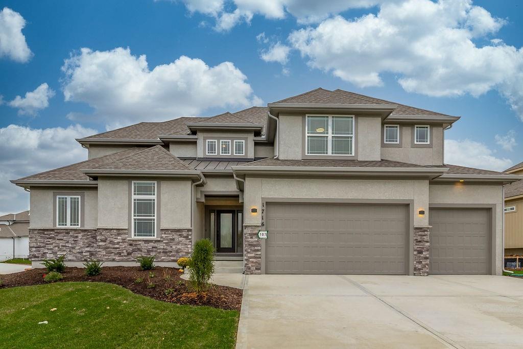 The Brooklyn by New Mark Homes is a 1.5-story walkout residence located in Cadence—a thoughtfully designed, master-planned community by Hunt Midwest. With an estimated completion of January 2026, this 4-bedroom, 3.5-bathroom home offers over 2,800 square feet of elevated living, blending intentional design with everyday functionality. From the moment you arrive, the dimensional front elevation makes a striking impression. Inside, you'll find a spacious, open-concept layout featuring custom-built cabinetry, quartz countertops, a walk-in pantry, and an oversized island—ideal for daily routines and effortless entertaining. The kitchen flows seamlessly into the great room, where a floor-to-ceiling tiled fireplace serves as a stunning focal point. A walkout deck extends your living space outdoors—perfect for relaxed evenings or weekend gatherings. Upgraded trim and designer-selected finishes throughout the home add depth, detail, and polish to every space. The main-level primary suite offers a quiet retreat with a spa-inspired bathroom, freestanding soaker tub, and dual vanities. There's an office on the main floor for added convenience. Upstairs, a loft anchors three additional bedrooms—each with bath access—offering privacy and versatility for family or guests. Cadence residents enjoy access to a range of neighborhood amenities, including a community pool, winding walking trails, and nearby Platte Purchase Park. Located in the award-winning North Kansas City School District and within Staley High School boundaries, this home delivers an ideal combination of style, location, and livability. Taxes & square footage are approximate.