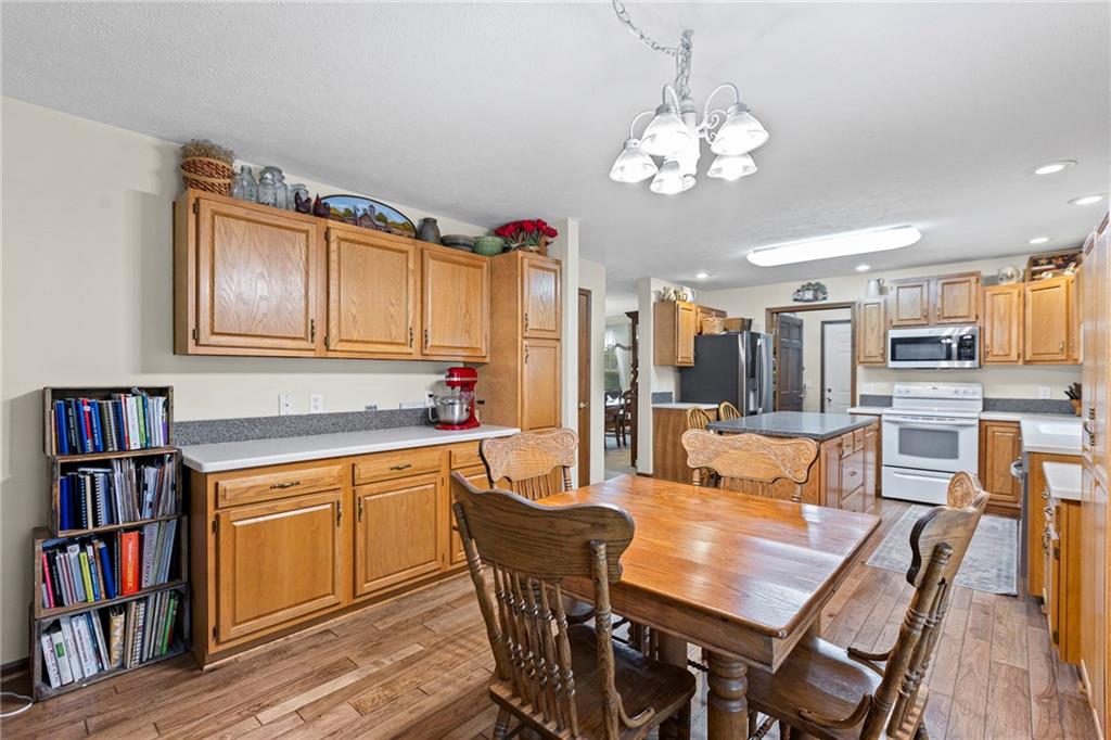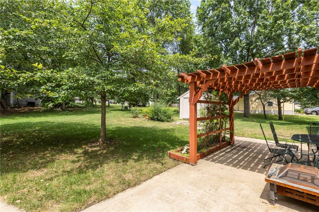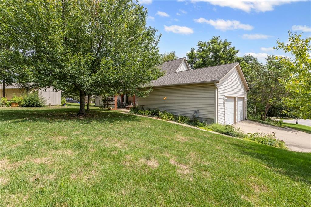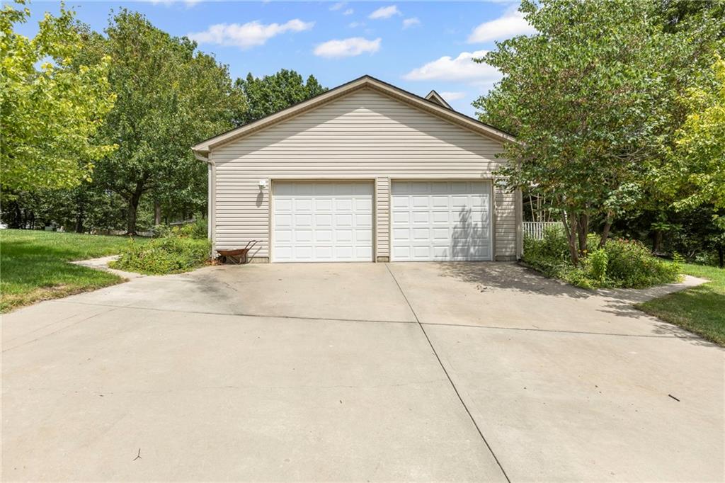 An inviting 8X60 front porch welcomes you to this beautiful three-bedroom, two-and-a-half-bath home, nestled on a nearly half-acre lot in the private and highly sought-after Hickory Valley Subdivision. The main level is perfect for entertaining. The huge eat-in kitchen is a chef’s delight, with abundant cabinets, Corian countertops, a large island, two pantries with pull-out drawers, a built-in double trash can cabinet, and beautiful hardwood floors. The kitchen seamlessly flows into the great room, which features a cozy gas fireplace. A formal dining room and a second living area provide plenty of space for gatherings. The spacious primary bedroom ensuite offers a luxurious retreat, complete with double sinks, a soaking tub, and a separate shower. The second floor includes two additional bedrooms, a full bathroom, and a third living area that can easily be transformed into a family room, office, or rec room to suit your needs. A full basement awaits your personal touch, ready to be finished and customized. The large, tree-filled backyard is an outdoor oasis, complete with a patio, a pergola, and a shed. This home is located just 30 minutes south of Olathe, making it an ideal family home. With so much to offer, it won't be on the market for long!