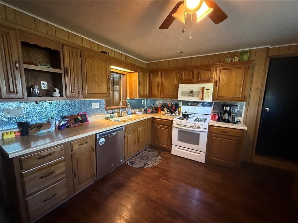 Large split-level home with five beds and two baths on three lots. Big kitchen with appliances included and a dining area. Big open living room with loft that leads to bedrooms. There is a bedroom and bath on first floor. Plenty of storage and a newer metal roof. Breezeway between house and garage.