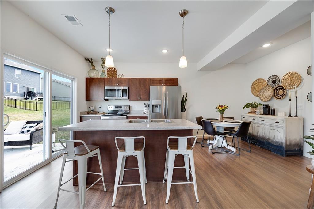 Better than new, turn key opportunity! This stunning two-story home offers 3 bedrooms, 2.5 baths and a 2 car garage. The open-concept kitchen features a spacious island, quartz countertops, stylish tile backsplash, and flows seamlessly into the dining and living areas with beautiful LVP flooring throughout. The expansive primary suite boasts a luxurious en-suite bath with a double vanity, shower, and walk-in closet. Convenient bedroom-level laundry adds ease to your daily routine. Located in a vibrant amenity-rich community, residents enjoy access to a pool, playground, firepit, and upcoming pickleball & basketball courts plus frisbee golf!