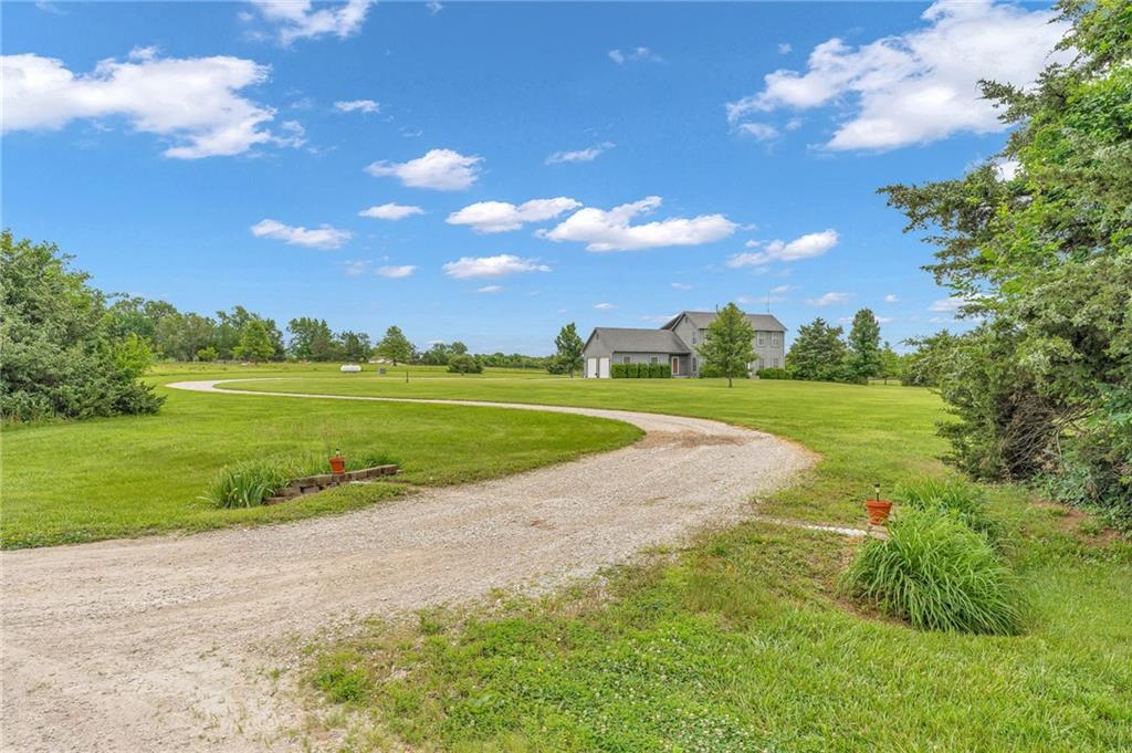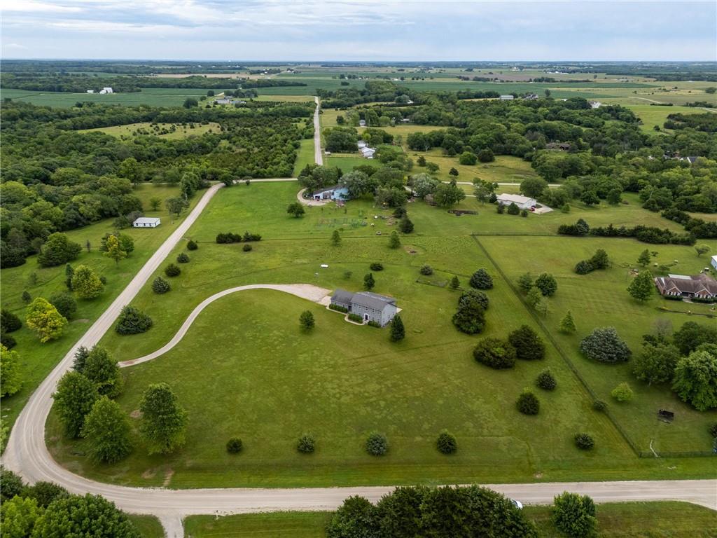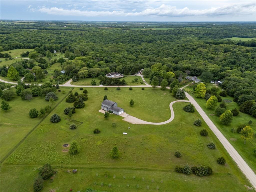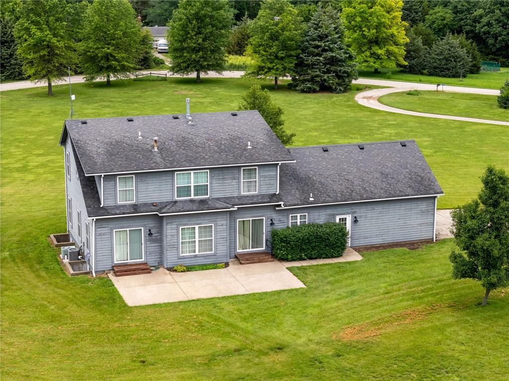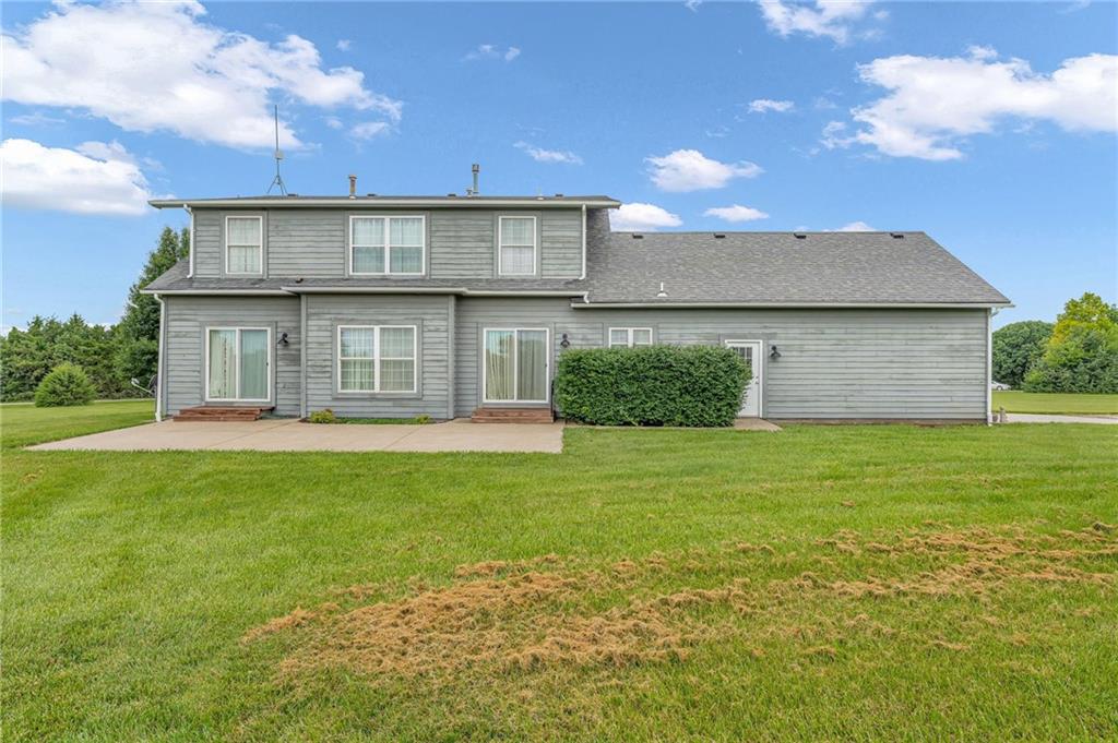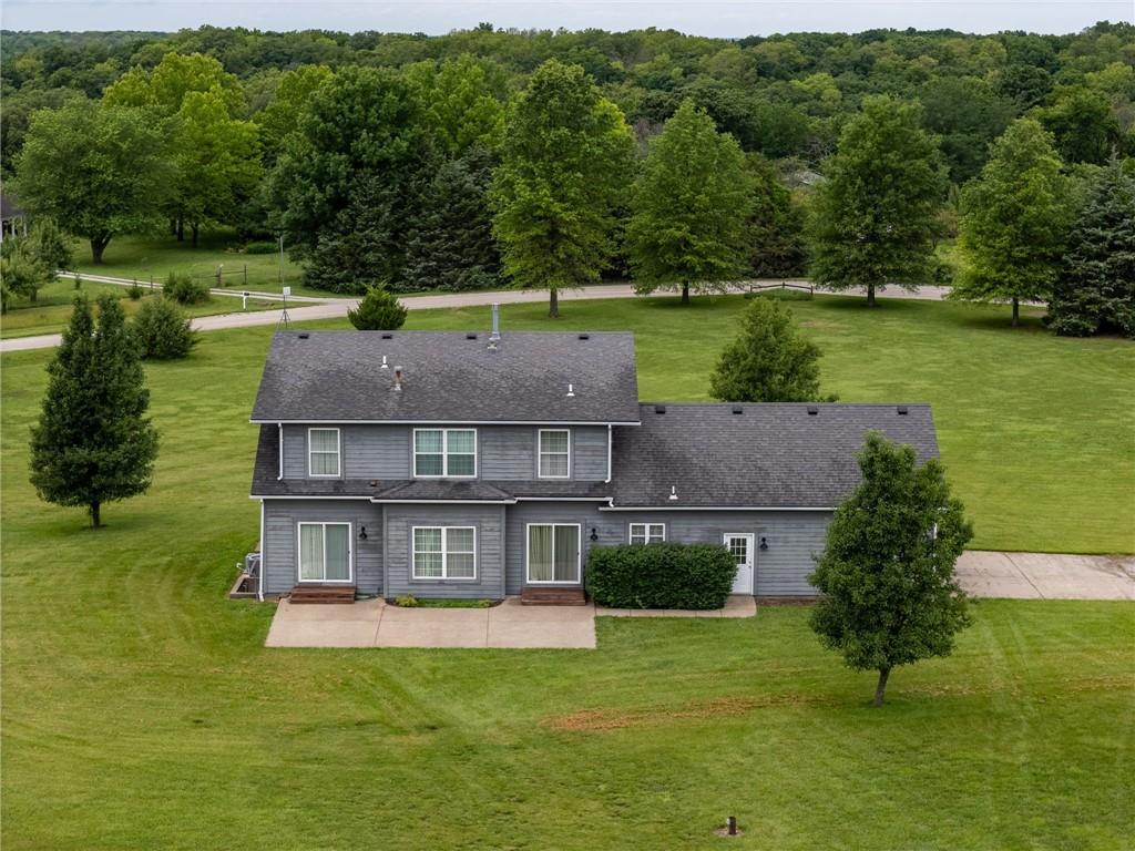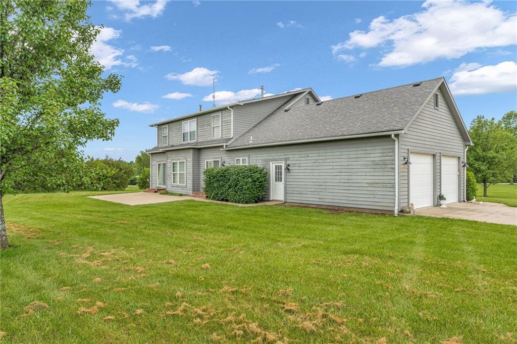 Set on five open acres just minutes from Highway 59, this two-story home offers space, flexibility, and a peaceful setting with easy access to town. Built in 2001, the home features a classic, New England inspired roofline that adds character while keeping the layout practical. A two-story entry with vaulted ceilings opens to formal living and dining areas that easily adapt to your needs. A main floor study provides a quiet space for work, reading, or hobbies. The family room centers around a stone fireplace and flows into the kitchen, which features custom wood cabinetry, an island range, pantry, breakfast area, and sliding doors to the patio. Main floor laundry is conveniently located near the garage. Upstairs, the primary suite includes an ensuite bath and walk-in closet, while three additional bedrooms share a full bath. The unfinished basement offers future potential with egress windows, plumbing for a bathroom, and a water-powered backup sump pump. Outside, the five-acre setting provides plenty of room to spread out, garden, or enjoy the outdoors. Enjoy the freedom to live your way, with space for entertaining, hobbies, and everyday life.
