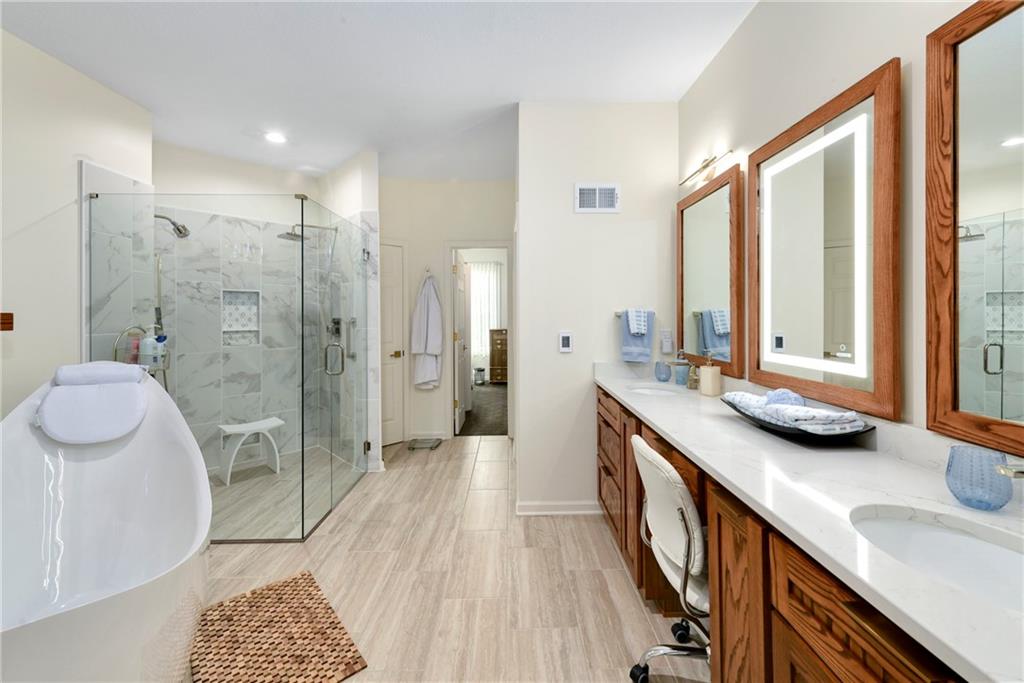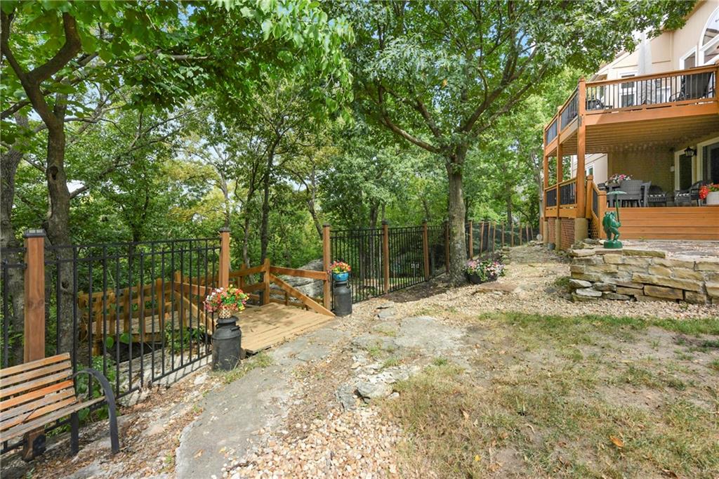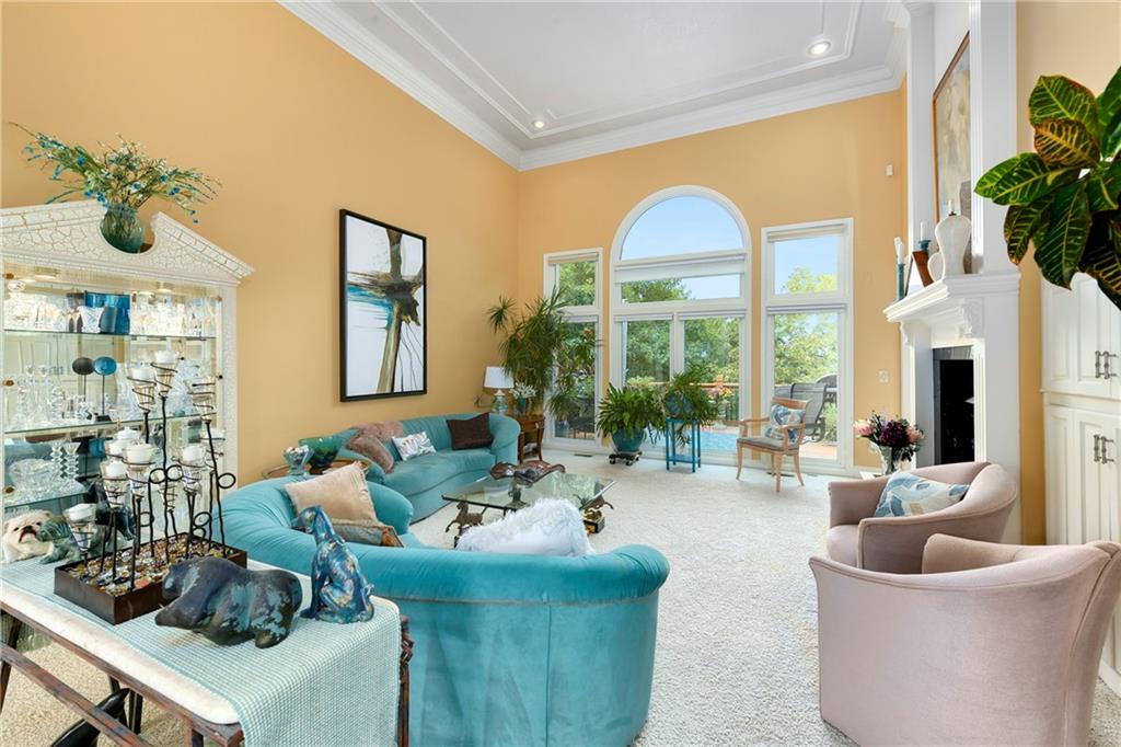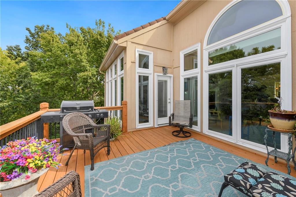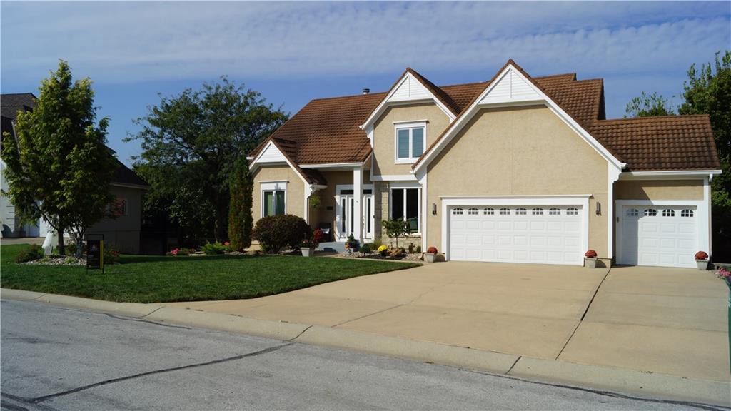 House has been freshly painted throughout. Highly desirable Arbores neighborhood in the Blue Springs school district. Neighborhood includes two lakes (with fishing), and beautiful streets for strolling. Yard professionally landscaped within the last year. Main level includes a two story foyer, Great Room, formal dining, large eat in kitchen with hearth room, laundry, powder room, access to upper deck and primary suite. Formal dining room and Great Room are open plan with partial opening to kitchen. Hearth room, included within kitchen space, features a see thru fireplace to Great Room. Kitchen/Hearth room/Great room have wall to wall windows with great view of trees. Large primary bedroom has tray ceiling, wall to wall windows and recently remolded master bath with heated tile floors, custom designed dual vanity and large zero entry shower and soaker tub in front of the see thru fireplace between master bedroom and bathroom. Upstairs are 3 large bedrooms with walk in closets, one bedroom has private bath with a Jack/Jill bathroom between the other 2 bedrooms. Upstairs also includes a large cedar closet for off-season clothes storage. Upstairs has a separate HVAC system. Extra large lower level with walkout to lower deck. Lower level is open plan and includes a full bathroom, kitchenette area with sink/cooktop/refrigerator/cabinets, large gas fireplace with mounted tv and two person office area. Plenty of room for entertaining- large gatherings in front of TV, a pool/game table and dining table. Lower level also has 3 large storage closets. Unique and private backyard with decorative fencing, and ramp to lower area ideal for kids playset or gardeners paradise. Three car garage with epoxy floors, shelving and work bench.