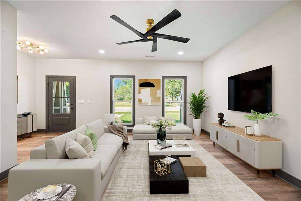 This brand new 3-bedroom, 2-bath home offers one level living and features an open concept floorplan for today's lifestyle. Luxury vinyl plank flooring throughout. Energy efficient led lighting with designer fixtures with brass accents. Kitchen features oversized island with brass faucet, quartz countertops and custom cabinetry. Primary suite off kitchen with access to laundry. Primary bath offers walk in shower. Two nice sized secondary bedrooms Large side entry garage. Patio for relaxing or entertaining. Custom front columns add to the curb appeal of this attractive functional home,