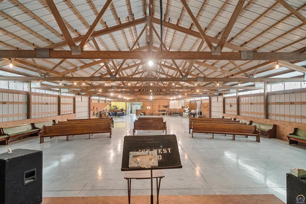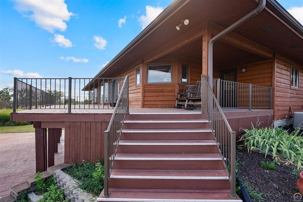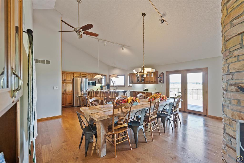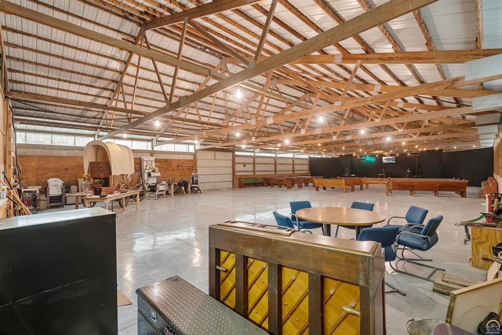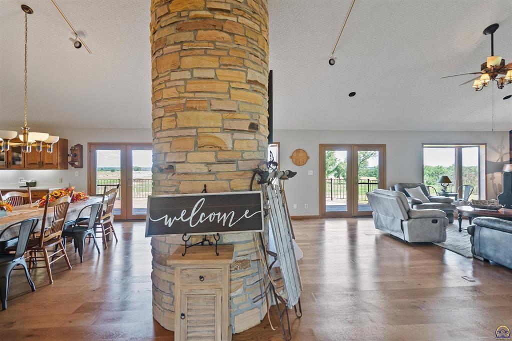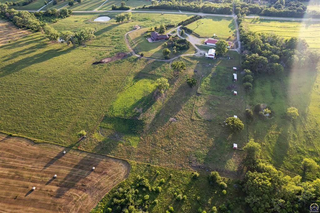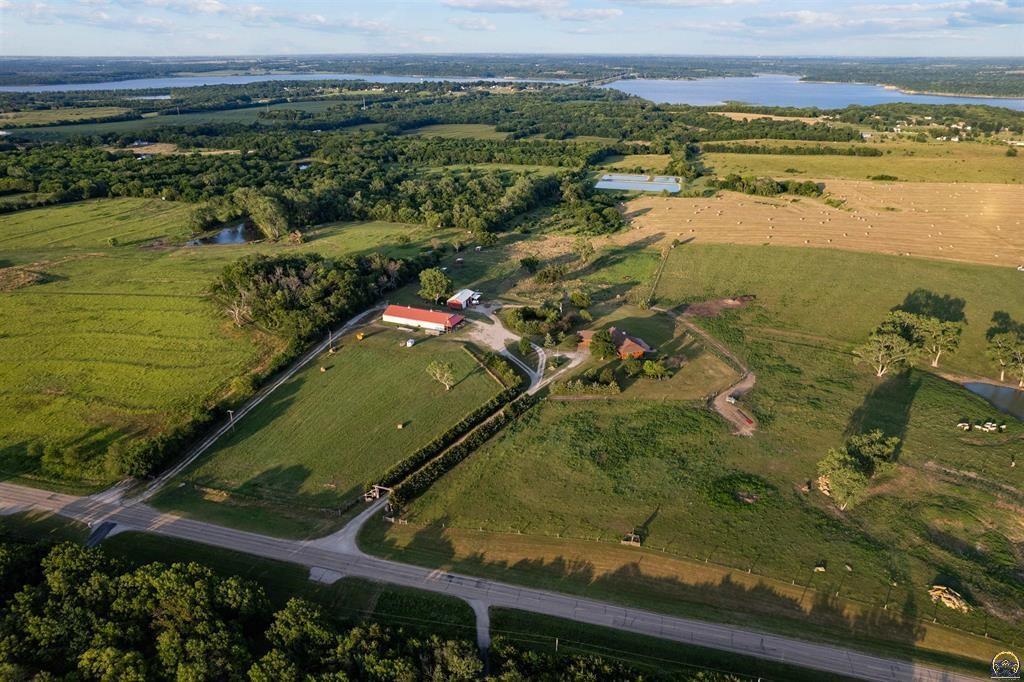 Stunning 18-acre country retreat overlooking Perry Lake with endless potential for an agricultural oasis, Airbnb, or event venue. This 5,000+ sq ft ranch-style home offers 4BR, 3.5BA, vaulted ceilings, 2 stone fireplaces, and a chef’s kitchen with walk-in pantry and island. The luxurious primary suite has a spa-like bath and dual closets. Also, the Walk-out basement features a 2nd kitchen, family room, office/conference space, and ample storage. Outdoor living includes a massive deck, covered patio, and spacious fire pit area perfect for entertaining. Nearly 9,000 sq ft of garage/workshop space includes a 30x60 shop and a 51x120 outbuilding with heated/cooled office and full bath. The property is Zoned Farm & Ag with 5 animal shelters, 4–5 fenced pastures, 6 hydrants, horse arena, and 2 RV hook-ups. Ideal for weddings, retreats, or hobby farming. This is the perfect home to live, work, and host with ease.