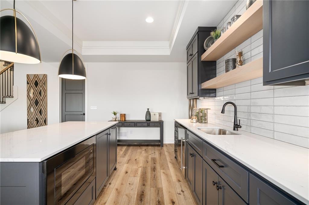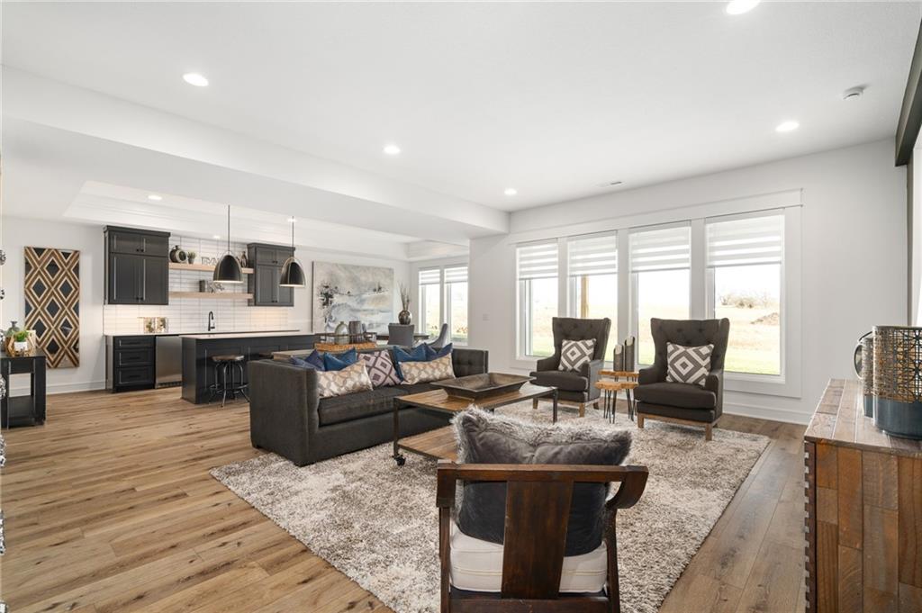 JFE Construction brings their fabulous Bayberry Rev. 1.5 sty plan to Johnson Counties newest maintenance provided community of Prairie Canyon! This beauty sits on a walkout lot with SE rear exposure backing to greenspace w/dramatic long vistas! Cathedral vaulted ceilings in the entry, Great rm & thru to the covered deck with FP. Open concept plan with Great rm., kitchen & dining all open to each other, large island & spacious pantry. Two bdrms & 2 baths on the main floor, 2 bdrms. & 1 bath down with plenty of Family & recreation space which includes a fantastic wet bar!