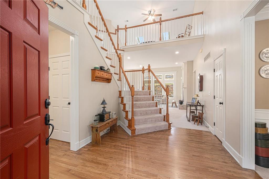 Discover this one-owner custom-built home nestled on 7.3 picturesque acres with a beautiful 1.5 acre shared pond. Featuring 4 bedrooms and 3.5 baths, this home is designed with both comfort and function in mind. The main floor features a spacious primary suite complete with a private sitting room, a well-appointed kitchen with quartz countertops, stainless steel appliances, hearth room, and Anderson windows that fill the home with natural light. Convenient main floor laundry adds ease to daily living. Upstairs, you'll find generous-sized secondary bedrooms along with a versatile loft space perfect for an office, playroom, or second living area. The unfinished basement, stubbed for a bath, provides endless opportunities for expansion. Outside, a 40x50 shop with two 12' doors, concrete floor, and electricity offers ideal space for hobbies, storage, or a small business. This property combines peaceful country living with modern amenities.