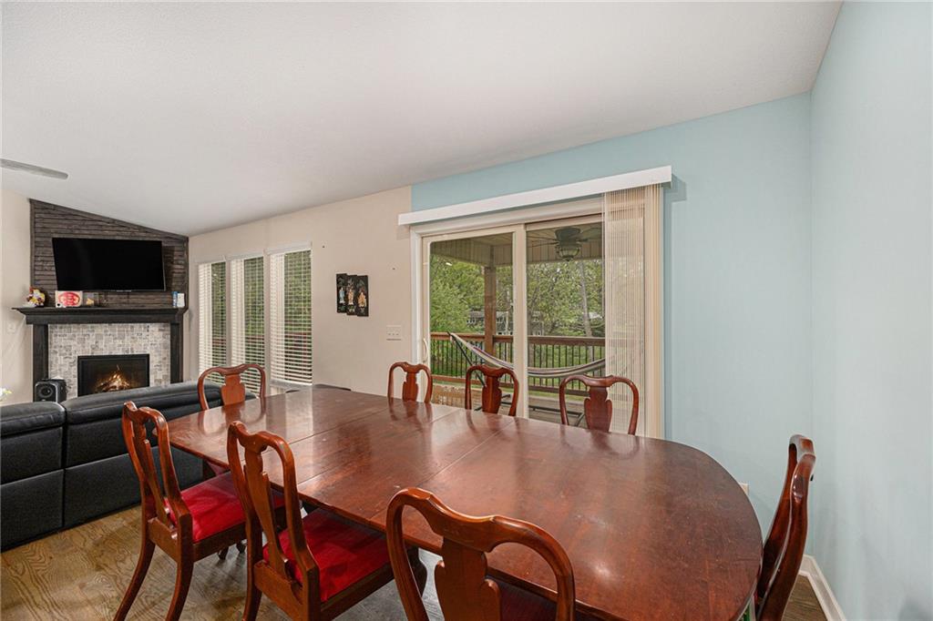 Welcome to this impressive four-year-old ranch home, perfectly situated for easy access to North Kansas City, shopping, the airport, and downtown. Featuring a three-car garage with an extra driveway on the third car side, this property combines convenience and modern living. Step inside to discover an open floor plan that seamlessly integrates the spacious family room, highlighted by a cozy corner fireplace, with the dining area and gourmet kitchen. The kitchen boasts elegant granite countertops and stainless steel appliances, making it an ideal space for both cooking and entertaining. Beautiful hardwood floors flow throughout the main level, welcoming ample natural light through multiple windows. The main level includes a serene primary bedroom complete with a private en-suite bathroom featuring a soaking tub, separate shower, and walk-in closet. A second bedroom and additional bathroom are conveniently located in the hallway. The lower level, accessible via carpeted stairs, offers a versatile third bedroom or a fantastic rec room, along with a large finished bathroom. A massive unfinished storage area is also available, equipped with double door access for easy accommodation of yard equipment. Enjoy the outdoors in the completely fenced backyard, featuring a gently sloping yard, an oversized deck (half-covered with a ceiling fan), and an open deck for sunbathing. Steps lead down to a concrete patio below, perfect for summer gatherings. The additional small deck off the third car garage enhances outdoor living options.