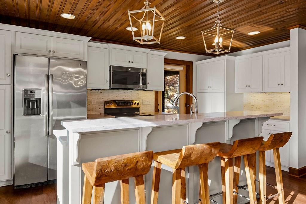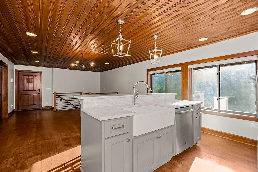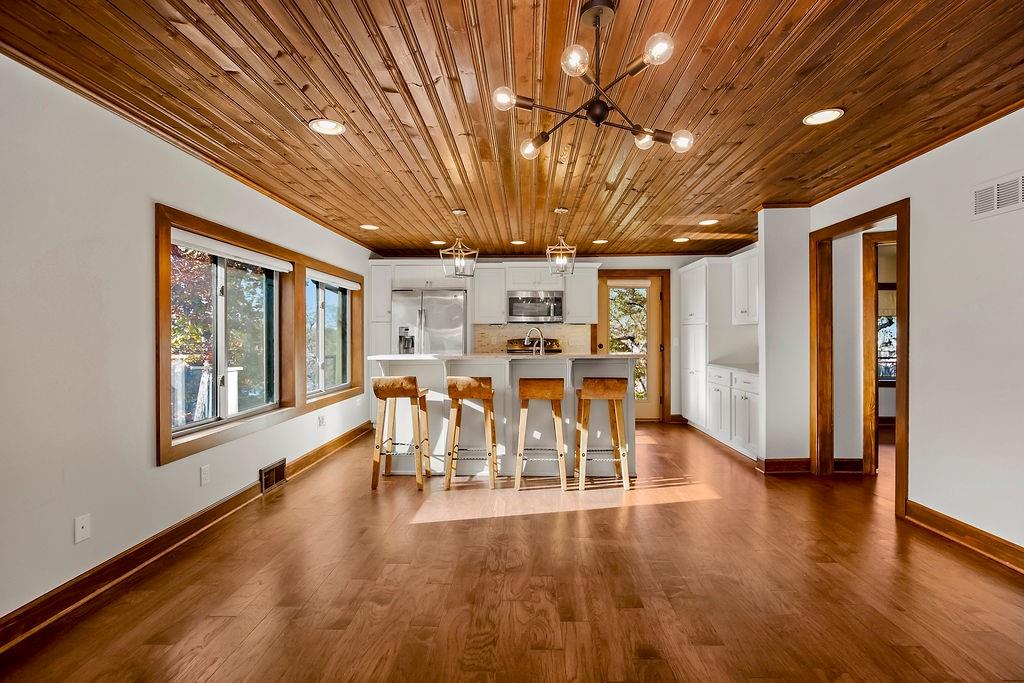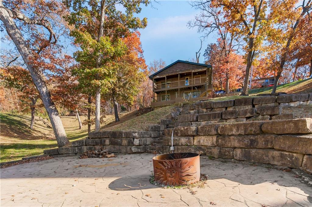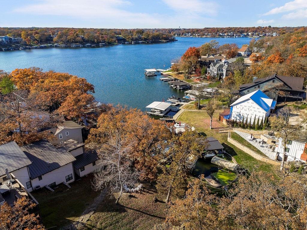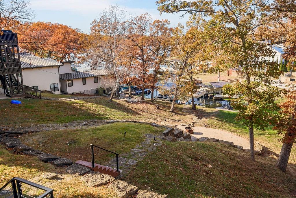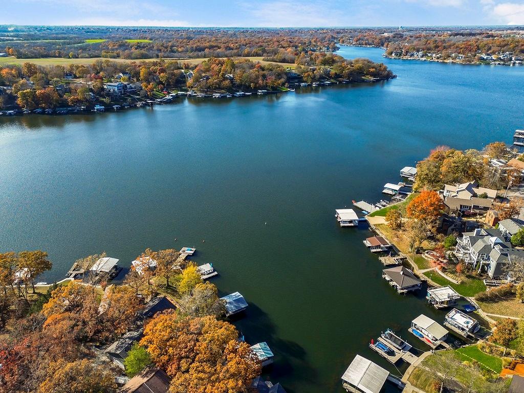Lake Lotawana's one of a kind, coveted log cabin! Perched on three lots, nearly a 1/2 acre of gorgeous lakefront property with an expertly utilized interior space. The main level greets you with gorgeous, recently refinished 5" wide hardwood floors, a cozy living room that opens to an updated kitchen with quartz countertops and an island with seating. The open, wide staircase leads you to the lower level walk-out that has been completely remodeled in 2022. A modern gas fireplace warms the room along with a bar nook with a mini-fridge and bottle storage. Two spacious bedrooms with egress windows and a full bath are also located in the lower area. The finishes have been constructed with very high quality material and workmanship. The exterior is PERFECT for entertaining. Gorgeous sunset views from the two brand new decks, a firepit area and a private dock with an electric, covered shore station lift. A calm cove, just off the main channel, safer for playing in the water and less dock wear and tear. Improvements galore! Since 2021, HVAC, tankless water, windows, metal roof, flooring, fireplace, electric panel, sliding doors, and decks. Lifetime warrantied foundation piers installed for a strong, sturdy structure. Plenty of space to spread out and not hit elbows with your neighbors and parking for up to 7-8 vehicles, a rarity in Lake Lotawana. This sale includes three lake front lots, the possibilities are endless to build a garage or another home. Lake Lotawana is a sought-after location with Kansas City's only waterfront restaurant accessible by boat. Take your golf cart just a few miles away to the community park, tennis courts, restaurants, and coffee shop. There is always something to do in this community; fishing tournaments, ski, sailing , kayak and community events, and so much more.