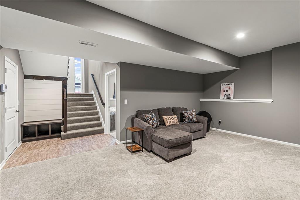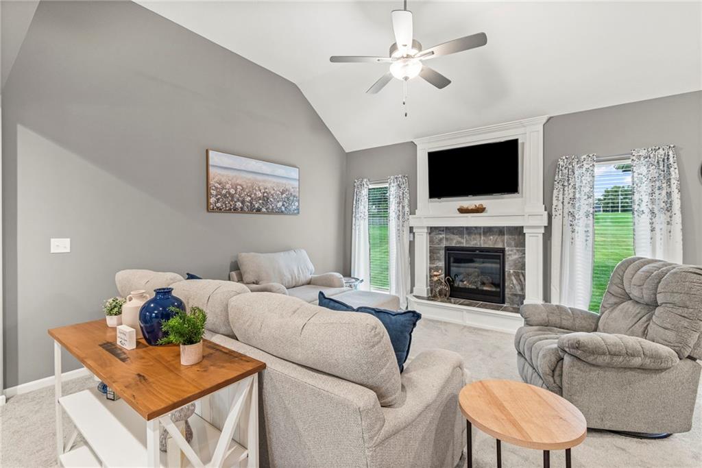 Step inside this nearly new Liberty home where thoughtful design and everyday comfort come together. The main level greets you with a spacious, light-filled living room anchored by a cozy gas fireplace and plush carpet that invites you to kick off your shoes and stay awhile. Just beyond, warm hardwood floors carry through the kitchen and dining area—an open, seamless space perfect for gatherings. The kitchen shines with quartz countertops, stainless steel appliances, ample cabinetry, and a pantry, while the conveniently located laundry room just off the kitchen keeps everything practical and within reach. The primary suite is privately tucked away, offering a peaceful retreat with a large walk-in closet and a spa-inspired bath complete with dual sinks, soaking tub, and separate shower. Two additional bedrooms and a full bath round out the main level. Downstairs, the finished lower level expands your living space with a generous family room ideal for movie nights, game days, or a cozy hangout spot. You’ll also find a fourth bedroom and third full bath—perfect for guests or a home office. Out back, unwind on the covered deck or entertain on the extended patio overlooking the beautifully maintained yard. With an oversized three-car garage and access to Clay Meadows’ neighborhood pool, this home blends small-town Liberty charm with modern style and convenience.