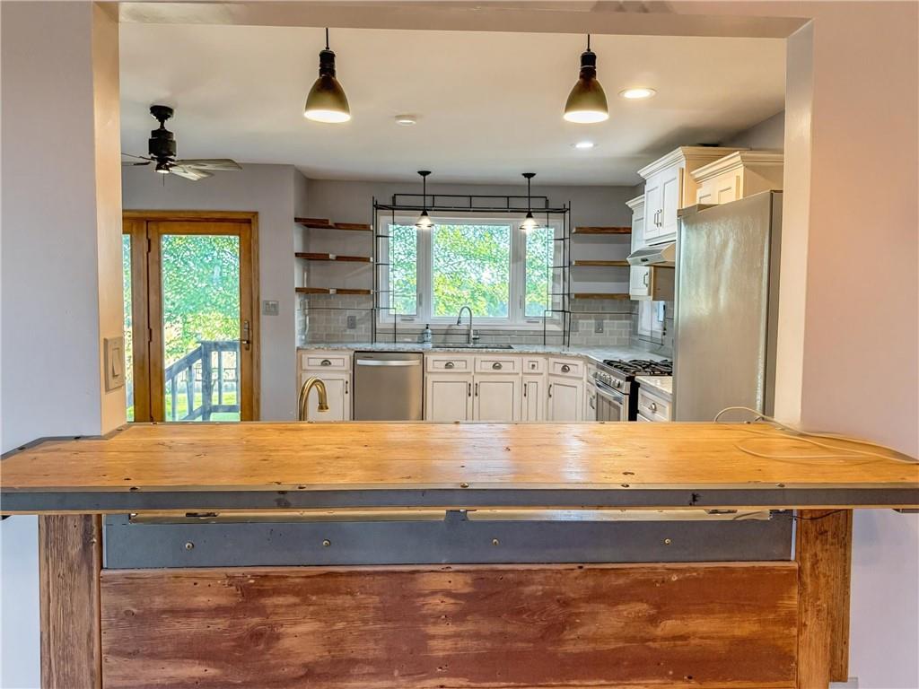 Beautifully updated 3-bed, 2-bath home on 0.80 acres with Hwy frontage and peaceful country views. Property includes the adjoining lot to the west, offering extra space and flexibility. Features include new unfinished hardwood floors ( can leave natural or stain to your desired color on your own) , wood ceiling over dining area, and a spacious open layout. Kitchen boasts slow-close cabinetry, quartz counters, tile backsplash & stainless appliances plus a large walk in pantry. Updated main floor bath with laundry in it. Lower level includes 2-car garage with shop area. Outbuildings stay. Custom mantle to be installed before closing