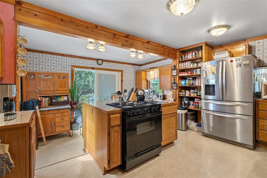 Welcome to this charming 110-year-old home, a timeless treasure that blends historic character with cozy modern comforts. Nestled in a welcoming neighborhood, this delightful property at 446 N. 16th St. in Kansas City, KS offers 3 bedrooms and 1 bathroom, making it an ideal haven for families, first-time buyers, or anyone seeking a warm and inviting space to call their own. With its rich history and thoughtful details, this home invites you to step into a piece of the past while enjoying the practicalities of today. Step inside, and you’ll be greeted by a warm, open living area that seamlessly flows into a spacious dining room. The interior boasts rich wooden beams and trim that highlight the home’s historic roots. Large windows flood the space with natural light, offering views of the lush backyard and creating a bright, airy atmosphere. The kitchen is the heart of this home, blending vintage appeal with functional design. Wooden cabinetry, crafted with care, provides ample storage, while a central island houses a modern stove and oven, ideal for preparing home-cooked meals. A sliding glass door opens to the backyard, seamlessly connecting indoor and outdoor living. The adjacent laundry area, tucked neatly into the kitchen layout, adds convenience with its practical setup. The home also includes a water filtration system, continental polymer siding with a 50 year transferable warranty, and leaf filter gutter covers with a lifetime transferable warranty against clogging. The backyard space is framed by mature trees, offering shade and a natural backdrop, with a small patio area perfect for outdoor entertaining. The presence of gardening tools suggests potential for further landscaping, allowing you to put your personal stamp on this lovely outdoor retreat. This home is filled with character, ready to welcome new memories. Don’t miss the opportunity to own this piece of history with all the comforts of modern living!