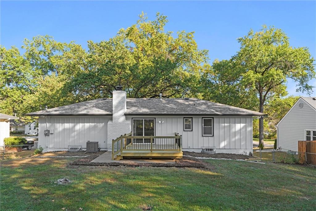 Completely renovated inside and out with everything fresh and new! This beautiful, open ranch is furnished with high-end finishes, a neutral color palette, and so much space to enjoy inside and out. Gorgeous curb appeal invites you in with freshly painted brick, wood shutters and a brand new front landing. Inside, refinished hardwoods run throughout the main level including all of the bedrooms. The open but cozy living room will have you wanting to curl up by the brick fireplace and enjoy views of the new back deck and fenced yard through the sliding glass doors. The kitchen is complete with fresh white cabinets, granite countertops and new appliances. Formal dining offers plenty of space for hosting gatherings, or expanding your living space. Three nicely sized bedrooms including a primary suite with a private full bath complete the main level, as well as a large guest bath that is all brand new. Downstairs, the full finished basement has a second large living space with a beautiful wet bar, a well-appointed laundry room, a fourth non-conforming bedroom with egress (just add a closet!), and a third brand new full bath. Located in lovely Red Bridge with easy access to highways, parks, hospitals, schools, popular kids activities and more. Welcome home!
