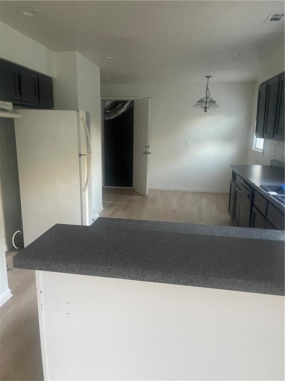 Kitchen with dark countertops, refrigerator, light wood-type flooring, dark cabinets, and decorative light fixtures