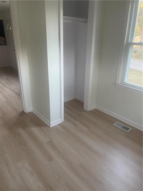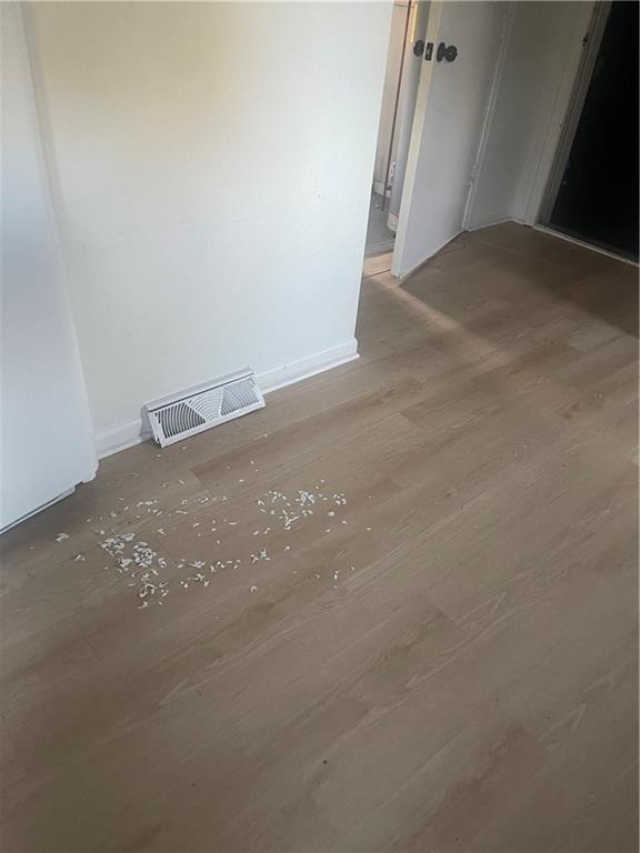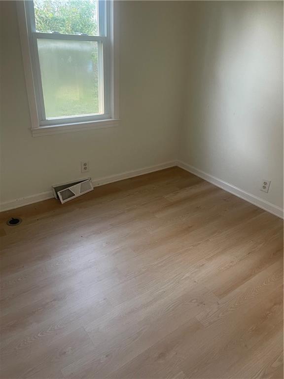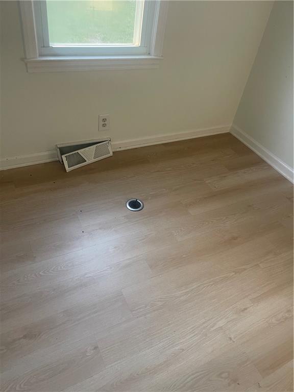 Spare room featuring light wood finished floors, a wall mounted AC, and ceiling fan