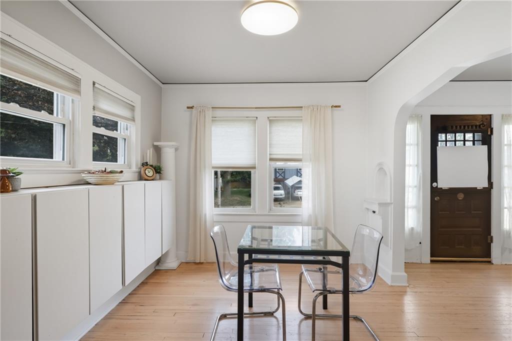 Welcome to this charming bungalow that blends vintage character with modern updates! From the inviting front porch with brick steps and wrought-iron details to the spacious backyard with mature trees and a detached garage, this home is full of charm inside and out. Step into a bright living room filled with natural light, hardwood floors, and a clean, neutral palette that flows throughout the home. The dining area features classic archways, built-in storage, and plenty of windows for an airy feel. The updated galley kitchen is both stylish and functional with sleek cabinetry, stainless steel appliances, and generous counter space. This home offers two bedrooms each with unique features plus an updated main bathroom. Outdoors, enjoy the deep fenced yard—ideal for pets, gardening, or gatherings—with a detached garage and additional storage. With its mix of old-world charm and modern convenience, this home is move-in ready and waiting for you!