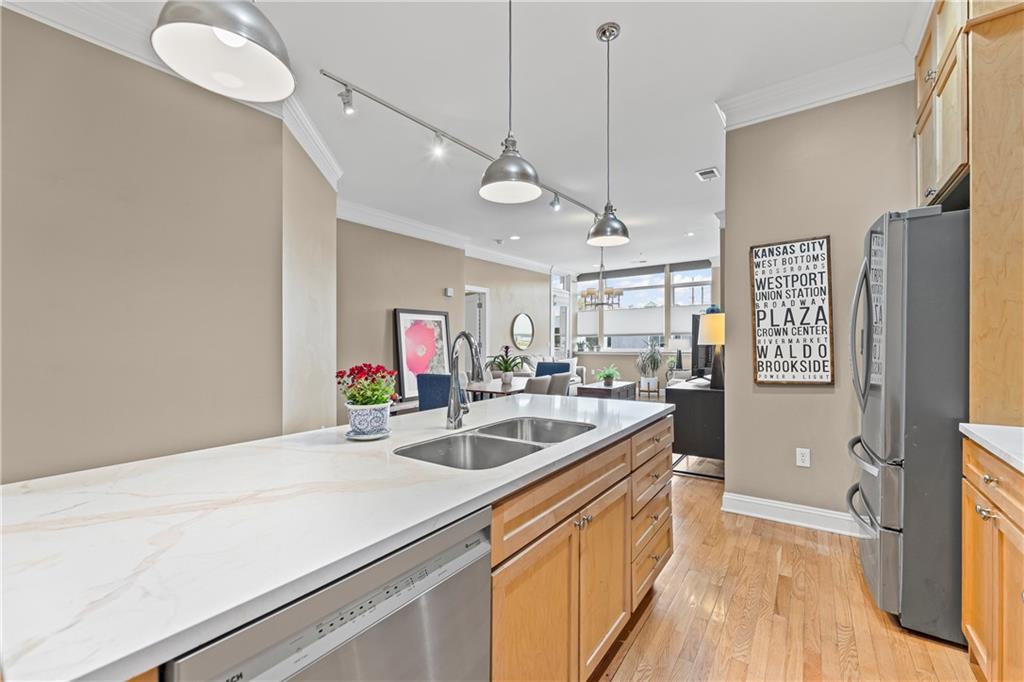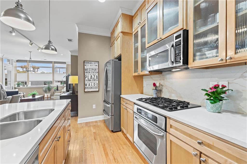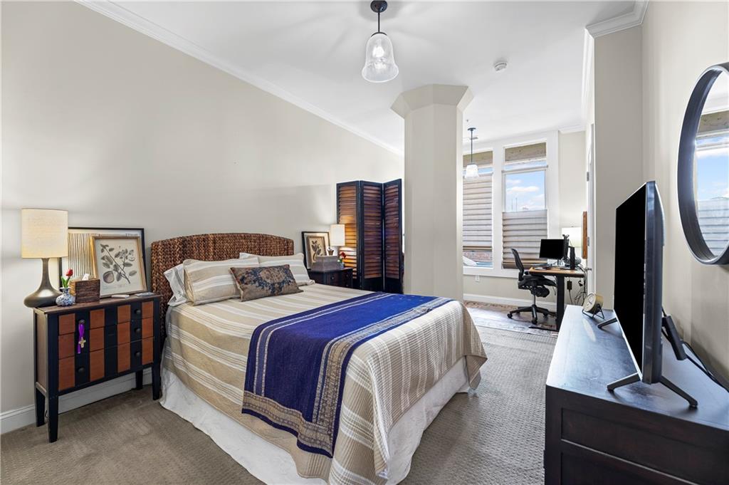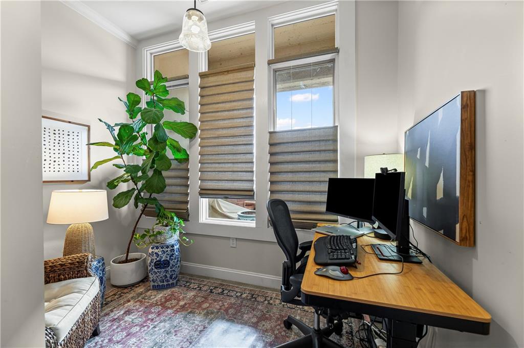 Experience elegant city living in this spacious condominium located in the historic Greenlease Cadillac building. The open floor plan is filled with natural light, creating a warm and inviting atmosphere throughout. The kitchen features a large island with seating, tall cabinets that extend to the ceiling for extra storage, and stainless-steel appliances that stay with the unit. The living room offers timeless character with its gas fireplace and opens to an private covered patio—perfect for relaxing, entertaining or gardening. A separate dining area provides additional space for gatherings. The spacious primary suite accommodates a sitting area and home office. The luxurious bath includes classic subway tile, a jetted tub, and a separate walk-in shower. The customized walk-in closet offers excellent storage and washer/dryer. The second bedroom, den, or office is conveniently located off the beautiful entry hall. Additional highlights include high ceilings, crown moldings, and hardwood floors throughout. Assigned garage parking included in the HOA. Enjoy the best of Union Hill—just steps from restaurants, coffee shops, bars, and shopping. The nearby streetcar provides easy and convenient transportation.