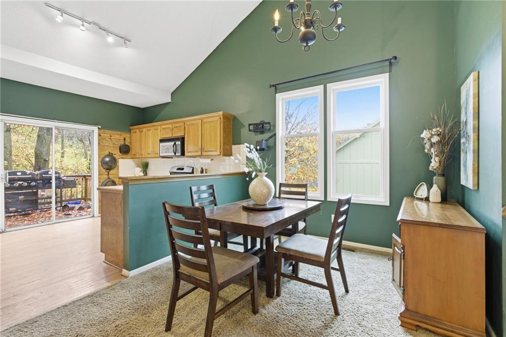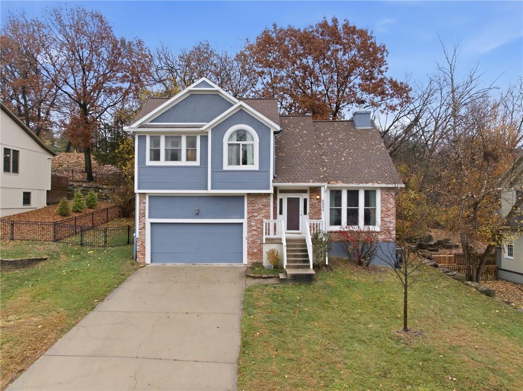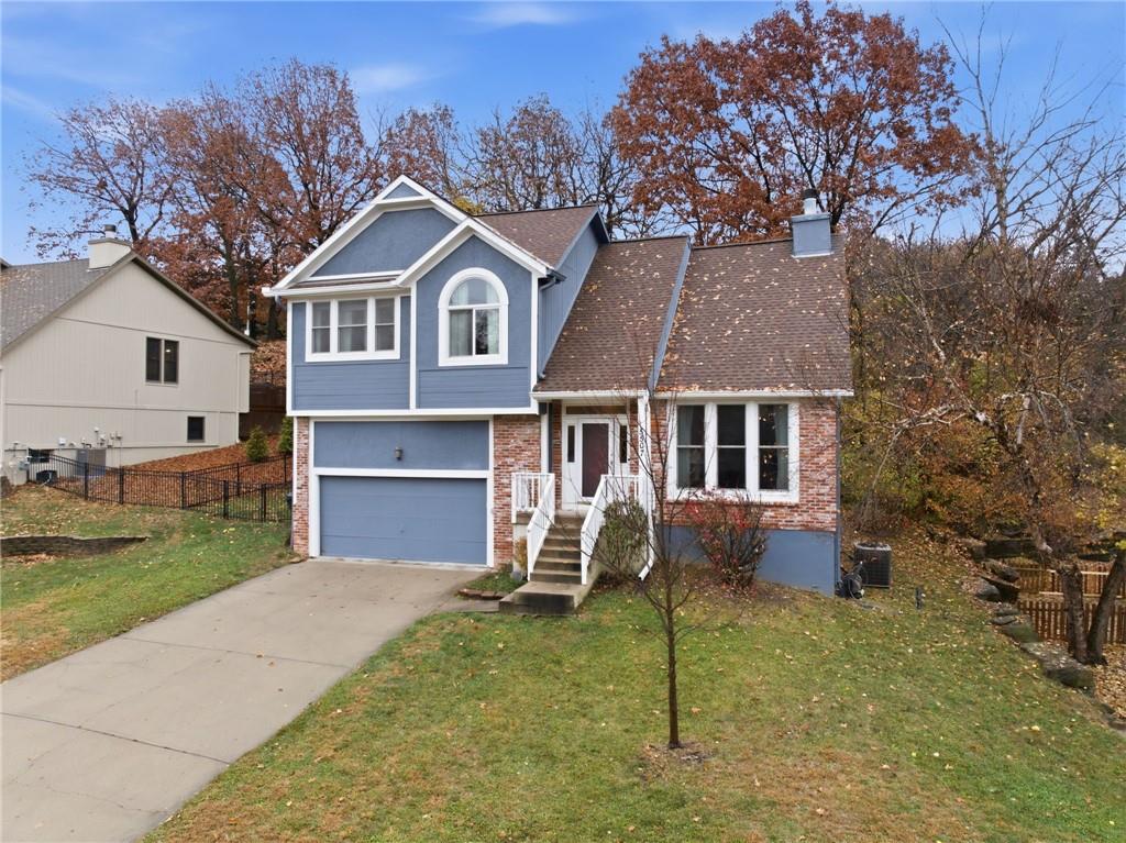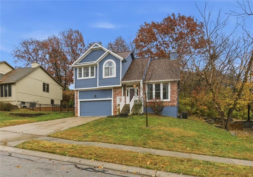 BACK ON MARKET -- NO FAULT Of SELLERS! Wind through the forested drive along Pflumm Road, where manicured lawns & well-kept homes lead you to Pflumm Woods—a picturesque Shawnee subdivision known for its peaceful charm & park-like setting. This beautiful home backs to a lush forest, offering privacy, shade, & year-round natural views. Step up to the inviting front entry & through the storm door into a hardwood floor foyer. To the right, the vaulted great room welcomes you with soft carpeting, a corner fireplace with a tile surround, & a large modern ceiling fan accentuating the soaring ceiling height. Just up the short staircase, the light-filled breakfast area opens to a thoughtfully designed kitchen with hardwood floors, rich stained cabinetry, a pantry, & a peninsula for added workspace & storage. Stainless steel appliances—including a gas stove—complete the space, while sliding doors open to a deck overlooking the treed backyard & a lower patio below. It’s the perfect spot for your morning coffee or an evening spent listening to the sounds of nature. Down the hall, two comfortable bedrooms share a beautifully updated bath featuring slate tile & a shower/tub combination. Upstairs, the private primary suite is a true retreat, complete with a sitting area, luxury vinyl plank flooring, & a stepped, vaulted ceiling with a ceiling fan. The spa-inspired ensuite bath boasts a double quartz vanity, an oversized soaking tub that opens to a tiled shower with dual showerheads, & a spacious walk-in closet conveniently located within the bathroom. On the lower level, you’ll find a cozy family room with a decorative ledge, a daylight bedroom, a full bath with tile flooring, & a laundry room. The interior entry to the garage is also located here for added convenience. Nestled among the rolling hills & wooded beauty of Shawnee and served by award-winning Shawnee Mission schools, this home perfectly blends nature, comfort, & everyday functionality.