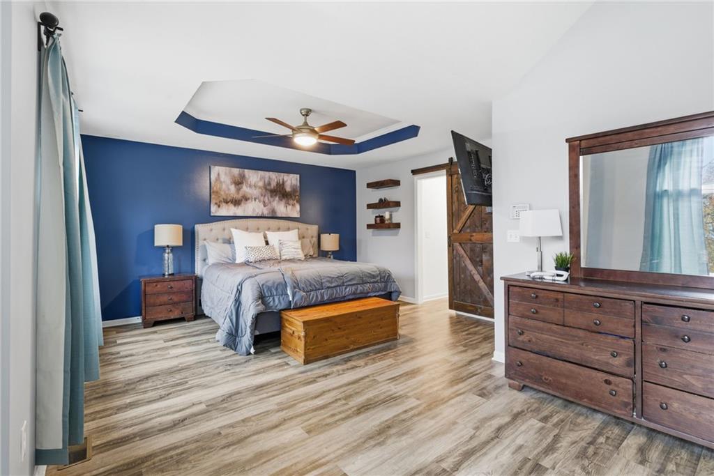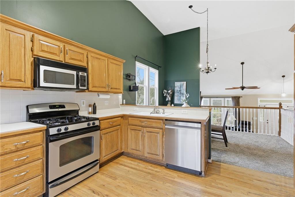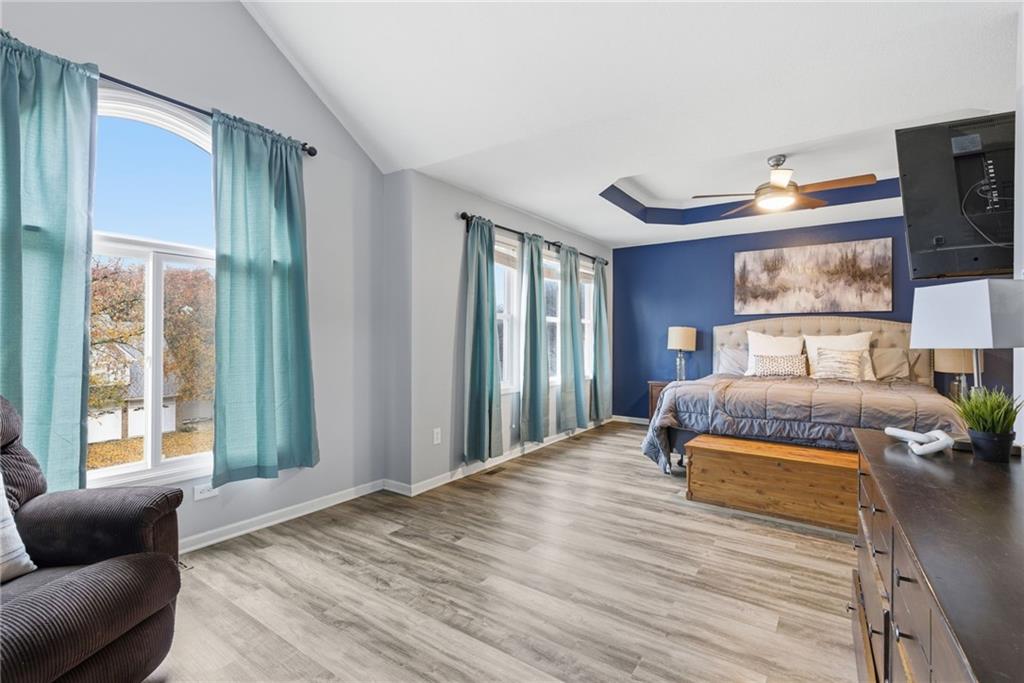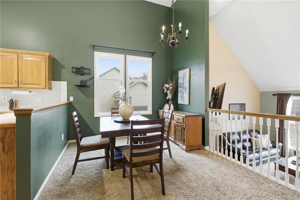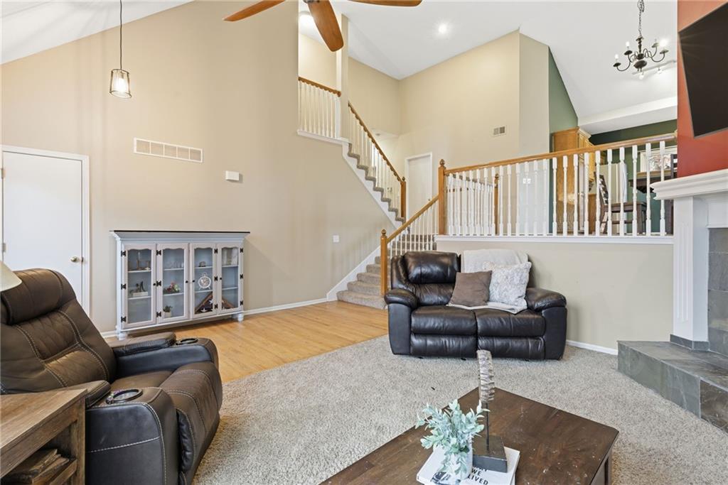 BACK ON MARKET -- NO FAULT Of SELLERS! Wind through the forested drive along Pflumm Road, where manicured lawns & well-kept homes lead you to Pflumm Woods—a picturesque Shawnee subdivision known for its peaceful charm & park-like setting. This beautiful home backs to a lush forest, offering privacy, shade, & year-round natural views. Step up to the inviting front entry & through the storm door into a hardwood floor foyer. To the right, the vaulted great room welcomes you with soft carpeting, a corner fireplace with a tile surround, & a large modern ceiling fan accentuating the soaring ceiling height. Just up the short staircase, the light-filled breakfast area opens to a thoughtfully designed kitchen with hardwood floors, rich stained cabinetry, a pantry, & a peninsula for added workspace & storage. Stainless steel appliances—including a gas stove—complete the space, while sliding doors open to a deck overlooking the treed backyard & a lower patio below. It’s the perfect spot for your morning coffee or an evening spent listening to the sounds of nature. Down the hall, two comfortable bedrooms share a beautifully updated bath featuring slate tile & a shower/tub combination. Upstairs, the private primary suite is a true retreat, complete with a sitting area, luxury vinyl plank flooring, & a stepped, vaulted ceiling with a ceiling fan. The spa-inspired ensuite bath boasts a double quartz vanity, an oversized soaking tub that opens to a tiled shower with dual showerheads, & a spacious walk-in closet conveniently located within the bathroom. On the lower level, you’ll find a cozy family room with a decorative ledge, a daylight bedroom, a full bath with tile flooring, & a laundry room. The interior entry to the garage is also located here for added convenience. Nestled among the rolling hills & wooded beauty of Shawnee and served by award-winning Shawnee Mission schools, this home perfectly blends nature, comfort, & everyday functionality.