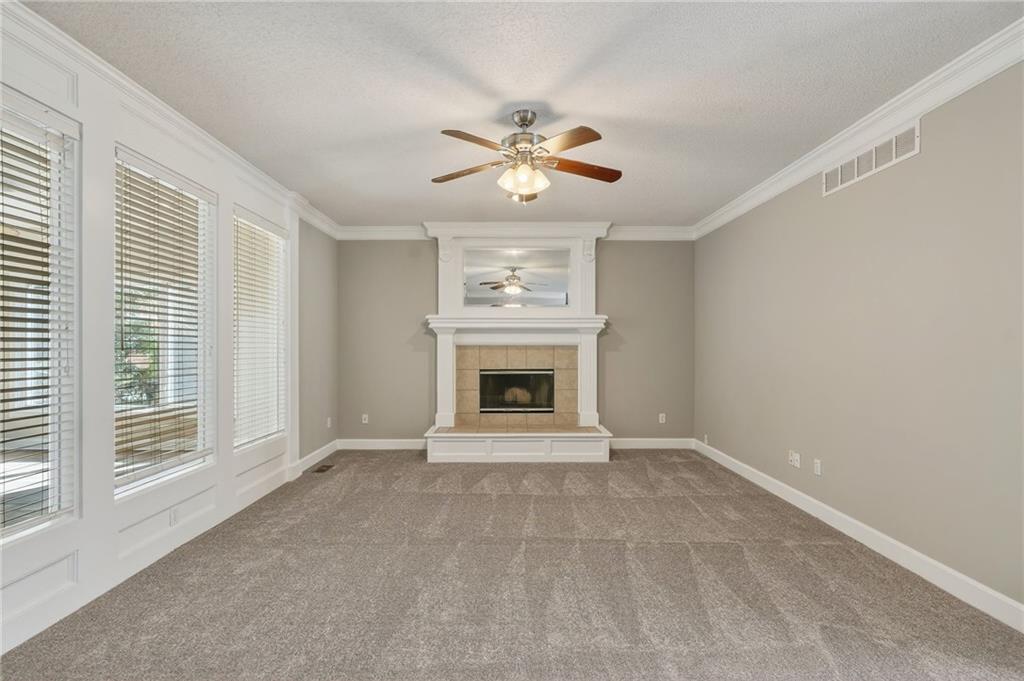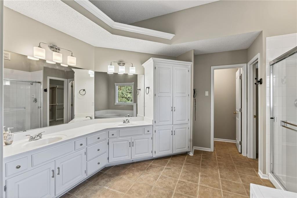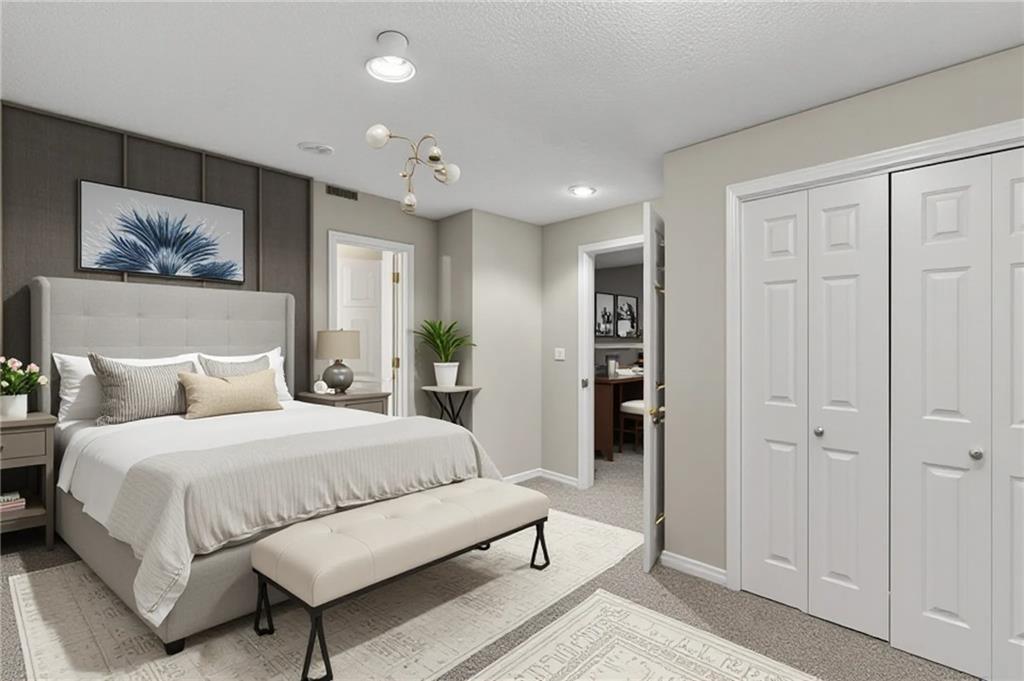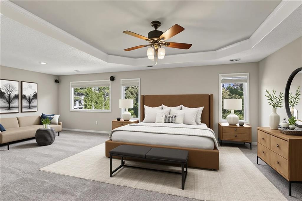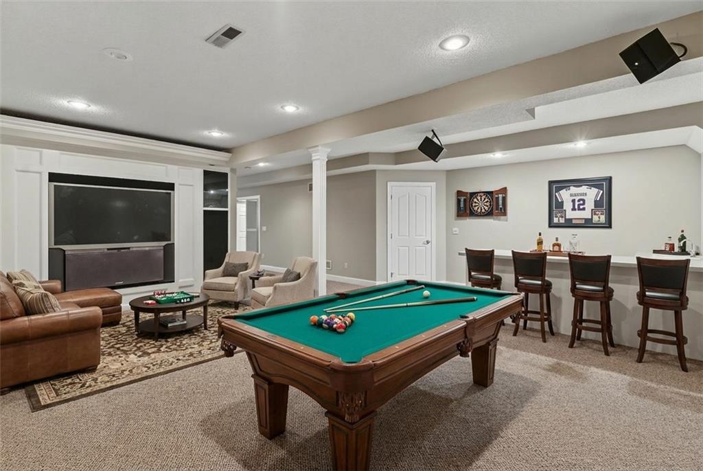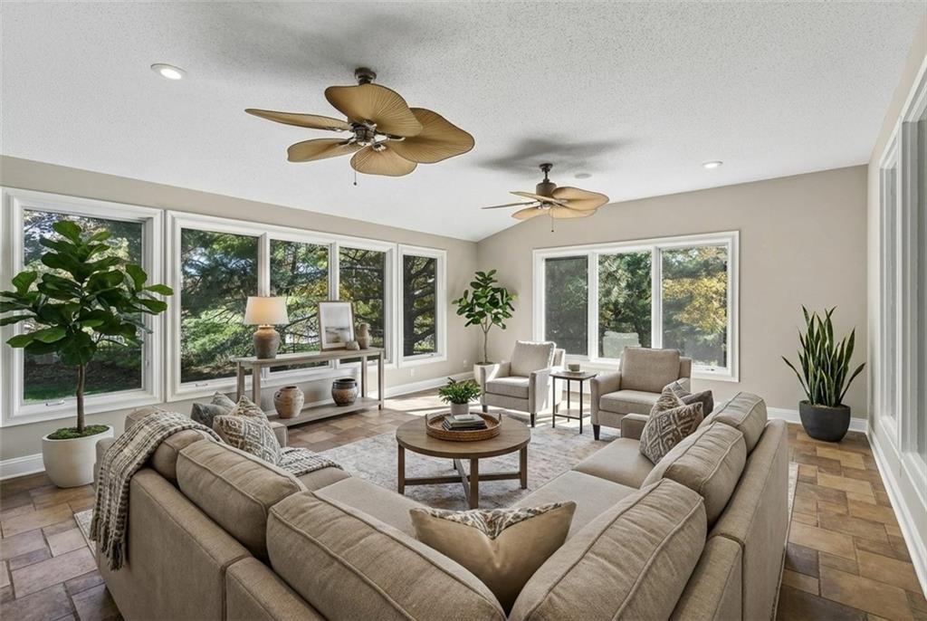 Welcome to a beautifully updated, luxury 4 (5) bedroom, 4.1 bath home tucked in a quiet cul-de-sac on nearly a half-acre lot! Step inside this light-filled residence showcasing elegant architectural details including a grand two-story entry with catwalk, formal dining room with custom wainscoting & bay window, & a spacious home office or bonus room. The expansive living room, anchored by a refined fireplace, flows effortlessly into the enormous sunroom—a stunning space ideal for large gatherings, a tranquil greenhouse, or year-round entertaining. The kitchen and hearth room serve as the heart of the home, featuring a granite island, generous pantry, & brand-new range & microwave—all appliances included. Enjoy the warmth of the second fireplace in the hearth area and a sunlit breakfast nook. Upstairs, the primary suite is a true retreat, complete with a sitting area, spa-inspired bath with jetted tub, abundant cabinetry, and one of the largest walk-in closets you’ll find. A private guest suite features its own full bath and walk-in closet, while two additional bedrooms share a convenient Jack-and-Jill layout with separate vanities. The finished lower level offers impressive versatility & space, including a recreation area with wet bar & theater setup, a game or bonus room ideal for entertainment or a private library, and a non-conforming 5th bedroom with full bath—perfect as a guest suite, fitness room, or additional office. Outdoors, enjoy a resort-style backyard designed for both relaxation and entertainment with a beautiful paver patio and private fenced yard surrounded by mature landscaping. The large basketball hoop, grilling area off the garage, and extra storage beneath the sunroom add both function and practicality. Zoned HVAC with 2 units! This home truly embodies luxury living with everyday comfort—offering space, style, and an unbeatable Overland Park location. Virtually staged to illustrate the home's potential. No physical furniture present.