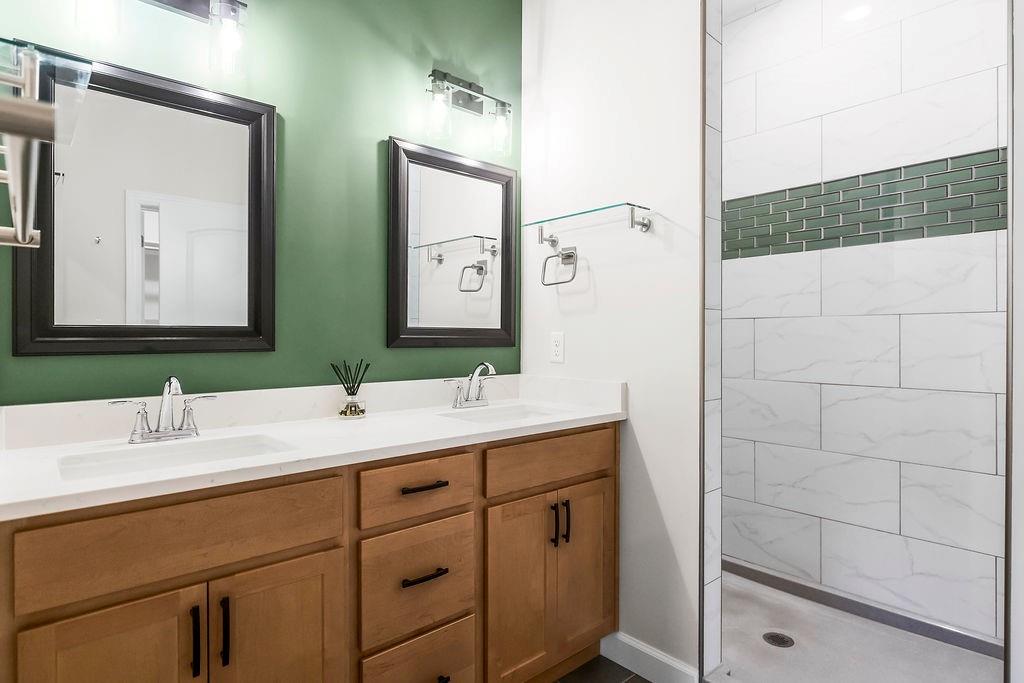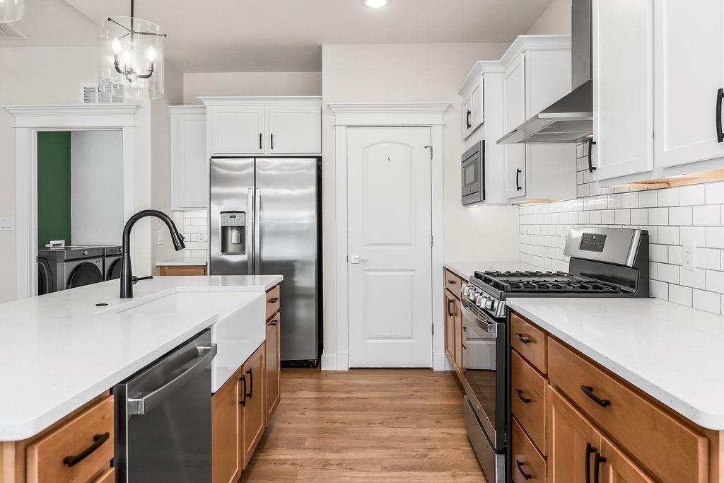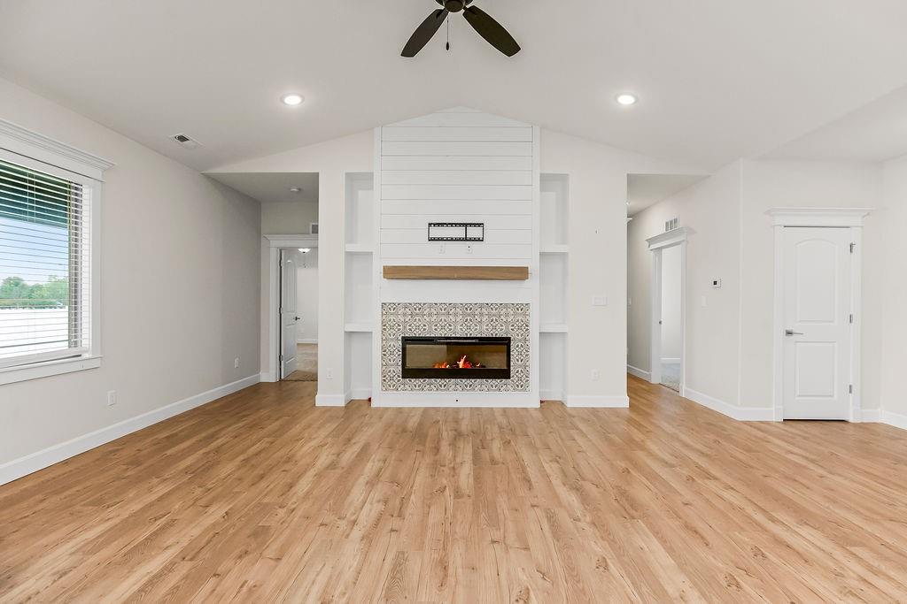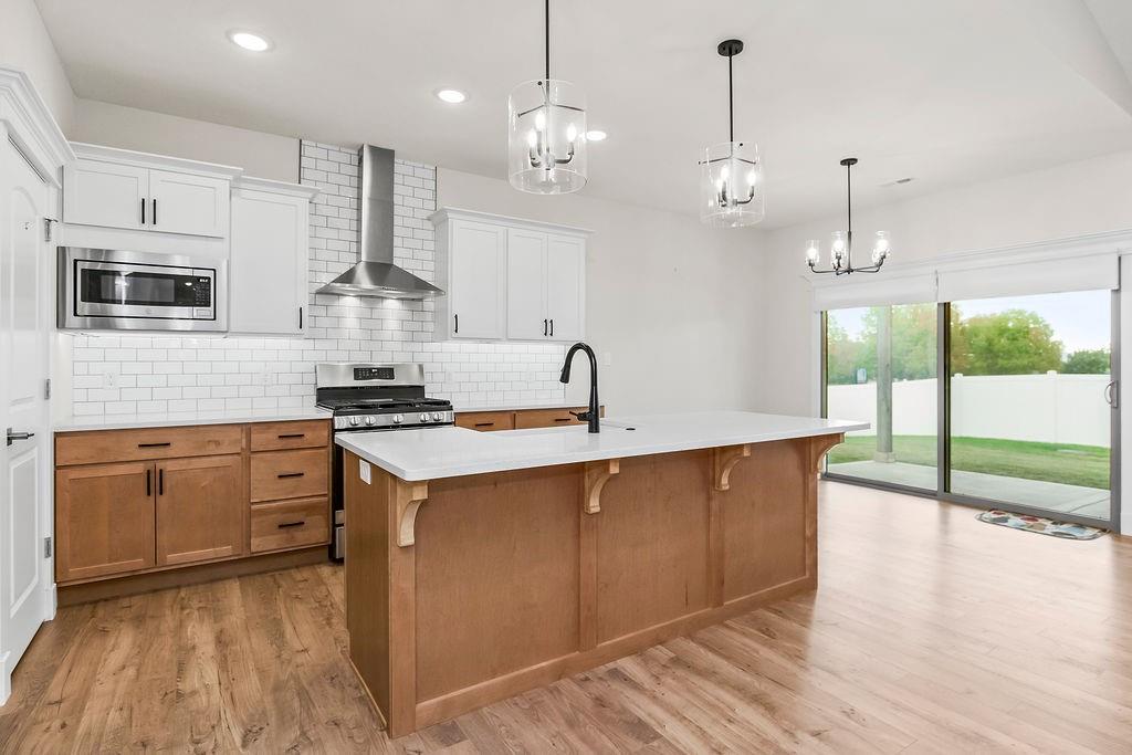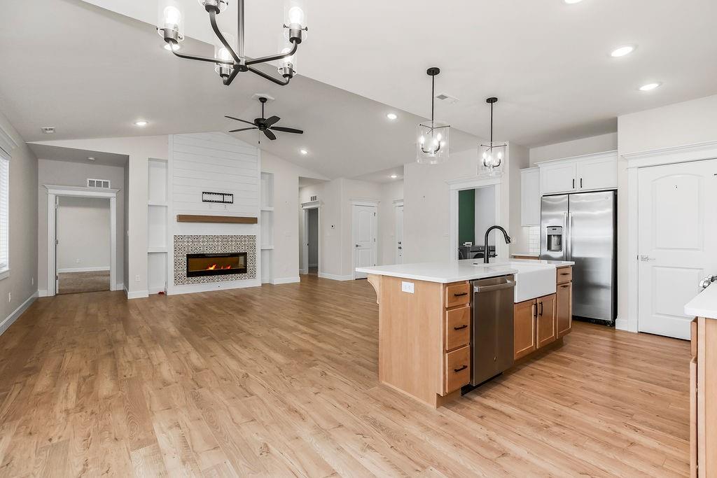 This beautifully updated ranch combines comfort, style, and effortless single-level living. The living room features a cozy fireplace and flows into a bright, two-tone kitchen with white upper cabinets, warm wood lower cabinets, quartz countertops, a center island, and a pantry—perfect for cooking and entertaining. Three spacious bedrooms include a primary suite with wood ceiling accent, a double vanity, and a bath with playful green touches. Outside you will find a fenced backyard with a patio, and enjoy the convenience of a three-car garage. This move-in ready home is as functional as it is inviting.