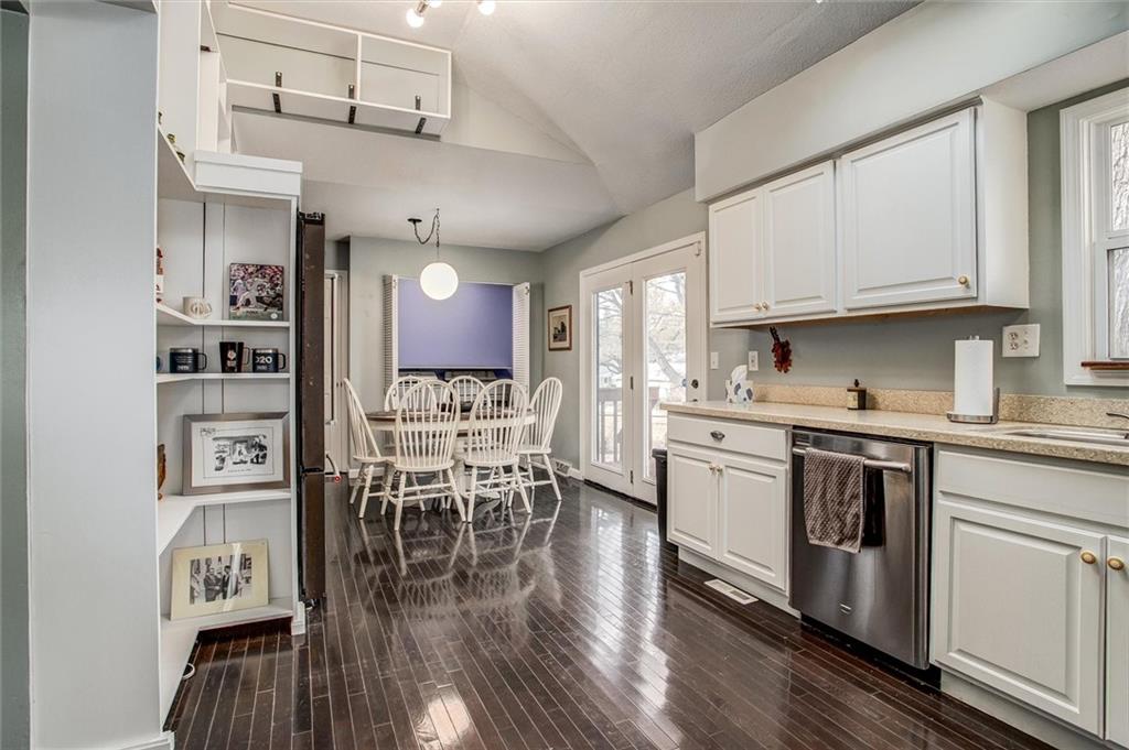 Unique and lovely West Waldo Ranch features a large eat-in kitchen with vaulted ceilings, skylight, floor to ceiling open shelving, granite countertops, pantry and stainless steel appliances. Fridge, washer and dryer are negotiable. Laundry hookups on both main floor and in basement. Large living room and main floor bedrooms with tons of natural light from the corner windows. Hardwood, ceramic tile, and new luxury vinyl plank floors. Recently updated bathrooms and kitchen. Newer hot water heater, new soffits and gutters. Large open recreation room, bedroom and full bathroom in the finished basement. Basement accessible through the house or garage. Foundation work/water management professionally installed with transferrable warranty. Detached getaway office/potting shed/hobby room behind the garage that is insulated and has an A/C unit. Big deck and large fenced backyard. Google Fiber, sump pump, security system, nest thermostat, and attic fan. Three cedar closets and tons of storage room. Great location in a convenient neighborhood close to shopping, groceries and restaurants. Quick access to the KC Metro.