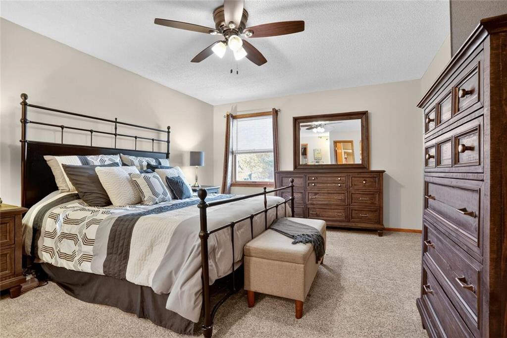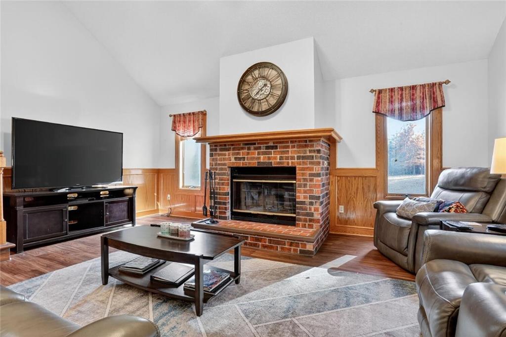 Peaceful Setting in Windmill Springs on an extra-large level (just over an acre!) Lot outside city limits w/no HOA, this 3 Bedroom, 2.5 Bath home offers flexible space for daily living. Entry features a vaulted ceiling, coat closet, & all-new LVP on the main level. The Great Room centers on a masonry brick Fireplace w/oak mantle & brick hearth, 17' Vaulted Ceiling, custom-blind Windows on two sides, library panel to chair rail, Ceiling Fan, & LVP. The Eat-In Kitchen includes black granite Countertops, ceramic tile Backsplash, oak raised-panel Cabinets, under-cabinet lighting, a corner composite farmhouse Sink framed by dual Windows, & a Pantry w/adjustable shelves. Stainless Appliances: Electric Range, Dishwasher & Refrigerator; black Built-In Microwave. Dining opens to a Composite Deck w/aluminum railing that steps to the Backyard. Main-level Laundry offers cabinets & extra storage. A Half Bath is conveniently located on the main level. Upstairs, the Primary Bedroom connects to a Flex Space/Office. The Primary Bathroom features two vanities, an upgraded cultured marble Shower w/glass doors & built-ins, and generous linen storage. Two additional Bedrooms are connected by a Full Bath. A T-shaped Hallway overlooks the Great Room & includes a built-in linen cabinet. The Front-Entry Garage is extra deep for vehicles(3 cars fit), gear, or workshop use, offering insulated Doors w/openers, finished walls & ceiling, over-nine-foot Ceiling height, built-in shelving, work bench, a side Window, & walkout access to the Backyard. Lower Level provides daylight Windows, tall ceilings, storage, & future finish potential. Systems include a Lennox heat pump & a Rheem water heater. Outdoor living adds a fenced garden area, mature trees, a fire-pit, a long concrete Driveway, & a quiet Cul-de-Sac setting. Served by Blue Valley School District. Everyday needs are close by across south Johnson County w/ quick connections to US-69 & 179th Street for commuting, parks, & community amenities.