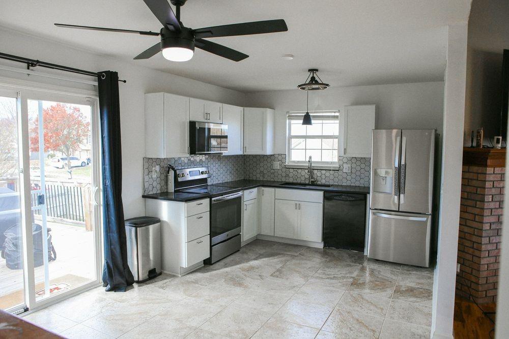 Open House this weekend: Saturday 2–4 PM Sunday 3–5 PM Stop by for an in-person tour or contact seller for a private showing. Beautifully updated home in the Northland with major improvements inside and out. The kitchen was fully remodeled in 2024 with quartz counters, new cabinets, tile floors, stainless-steel fridge, and a heat-sensing microwave. Updated lighting throughout the main level. The upstairs bath features modern black fixtures, new tub/shower hardware, and a new exhaust fan/light. Roof replaced in 2024. Exterior upgrades include new solar driveway lights, black shutters, railing, perennials, pavers, mulch, and a privacy-fenced walkout. Yard has been professionally treated and aerated. The garage offers a built-in workbench, shelving, keypad, and wiring for Google Fiber and Vivint. Quiet neighborhood close to schools, shopping, highways, and just 11 minutes from KCI.
