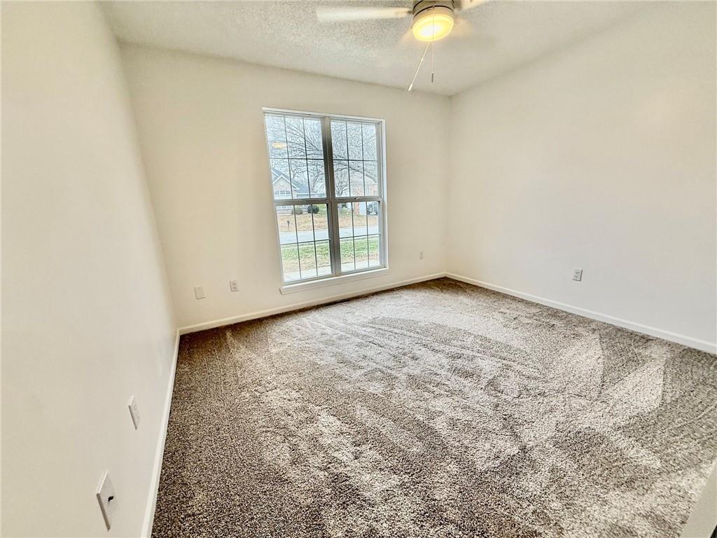 Carpeted empty room featuring a textured ceiling and a ceiling fan