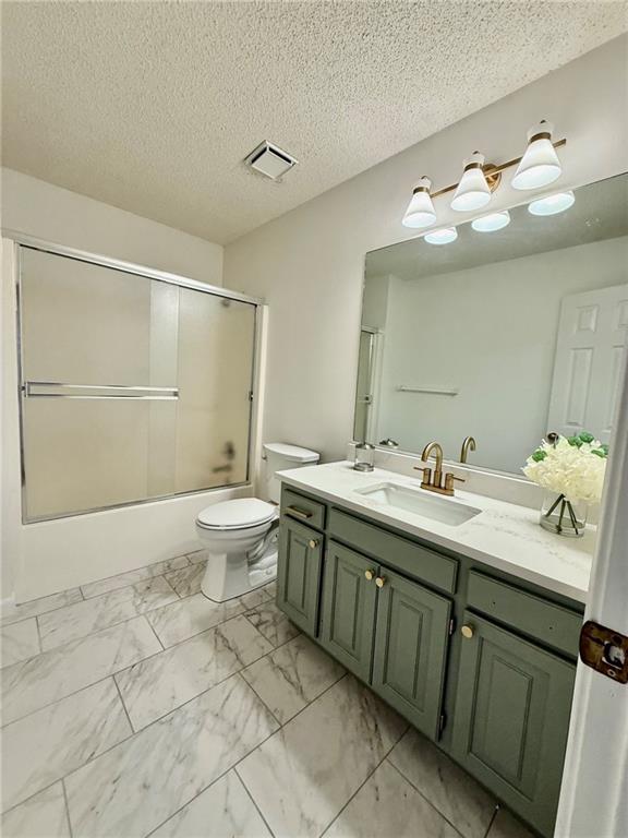 Full bathroom with vanity, enclosed tub / shower combo, a textured ceiling, and light marble finish floors