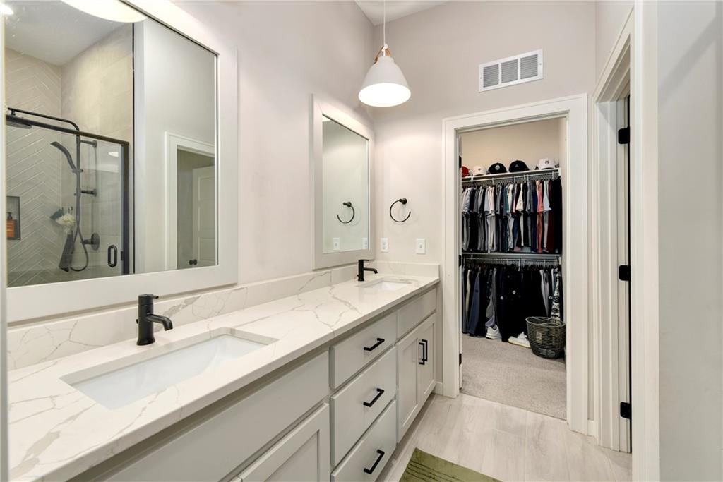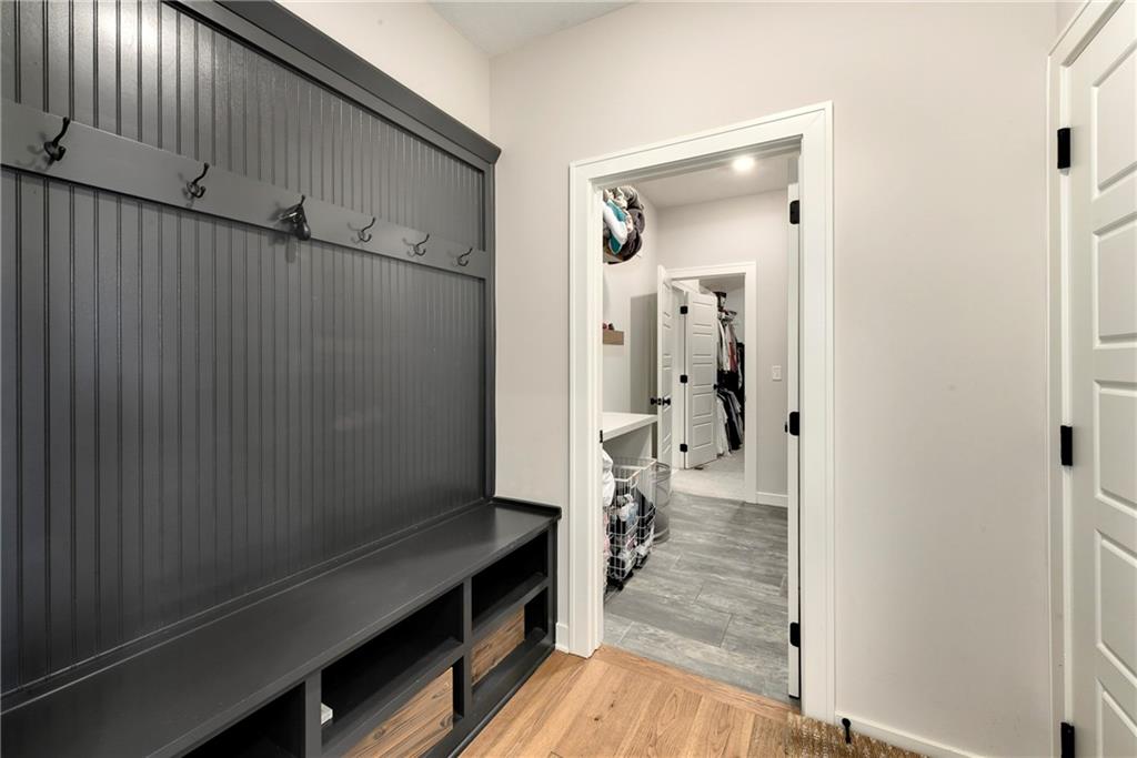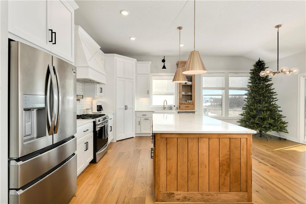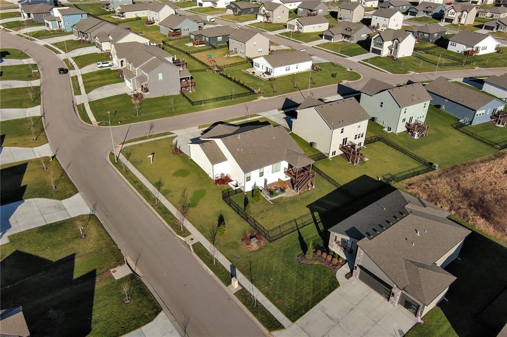Immaculate 2-year-old Reverse Ranch on a premium corner lot featuring a modern open layout, upgraded finishes, and exceptional indoor/outdoor living spaces. This former model home showcases a spacious great room with floor-to-ceiling stone fireplace, large windows for abundant natural light, and engineered hardwood floors throughout the main living areas. The designer kitchen includes quartz countertops, large center island w/ seating, upgraded trim, Gas Range w/Convection, pot-filler, stainless appliances, farmhouse sink, brushed brass fixtures, glass-door display cabinetry, and subway tile backsplash. The dining area flows seamlessly to the covered deck overlooking the fenced backyard. The primary suite offers a tray ceiling with wood plank detail, large windows, and a spa-inspired bath with dual quartz vanities, upgraded lighting, a walk-in tile shower with bench, herringbone accent wall, and matte black fixtures. The oversized walk-in closet connects conveniently to the laundry and mudroom w/ built-in drop zone. Additional main-level bedrooms include upgraded lighting & modern wall accents along with attractive wood finishes in the vanity and matching mirror. A second full bath features contemporary vertical tile and updated finishes. The finished lower level provides a generous second living area with recessed lighting, plush carpet, & a wet bar with custom backsplash. Additional bedroom & full bath offer flexibility for guests or extended living arrangements. The unfinished portion is plentiful too, providing value add for future finished space or great storage as it sits. Outdoor features include a covered deck, fully fenced yard with wrought iron fencing, and ample space for recreation. The climate-controlled garage is ideal for storage, hobbies, or year-round comfort. Additional upgrades include premium lighting throughout, wainscoting and trim accents, energy-efficient windows, & a clean modern color palette. Move-in ready and well maintained.