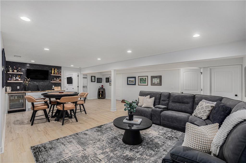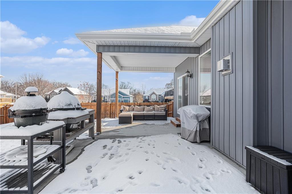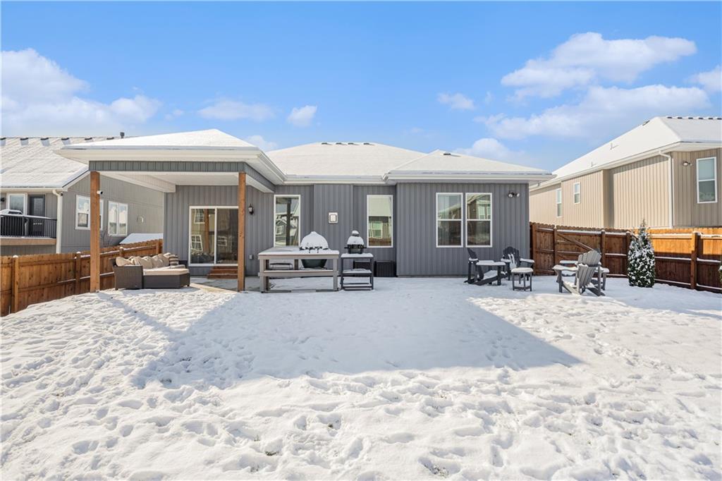 Why settle for new when you can embrace the elegance of this beautifully upgraded home, built in 2022. Step inside to discover a light, bright, and airy ambiance that creates an irresistible invitation to unwind and relax. This stunning residence features 4 spacious bedrooms and 3 full baths, complemented by an attached two-car garage and a fully fenced, beautifully landscaped yard that offers both privacy and curb appeal. As you enter through the front door, you'll be greeted by soaring high ceilings, gleaming wood floors, and an open floor plan that seamlessly flows throughout. The heart of the home is the expansive white kitchen, showcasing luxurious quartz countertops and a chic grey tile backsplash. The oversized island provides additional seating, while a walk-in pantry, gas stove, and stainless steel appliances complete this chef’s paradise. The kitchen elegantly opens to a sunlit living room adorned with a tiled fireplace, floor-to-ceiling windows, and a charming dining area featuring an accent wall that adds character and warmth. Your primary suite is conveniently located on the main level, offering a generously sized bath with a double vanity, a spacious shower, and a walk-in closet that dreams are made of. Two additional bedrooms and a full bath are also located on the main floor, ensuring comfort and convenience. Don’t forget the thoughtfully designed laundry and mudroom, situated off the primary suite. Venture downstairs to the amazing newly finished lower level, where a cozy family room awaits, complete with a newly installed wet bar, a full bedroom, and an additional bathroom. There’s even an unfinished storage space for all your organizing needs! Step outside to an extended patio surrounded by a privacy fence, making this yard a perfect 10 out of 10. Nestled in the highly sought-after Platte County School District, this home is part of a vibrant community that offers a pool, playground, and scenic trails.